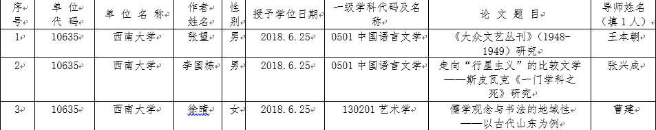 根据市教育委员渝教办函〔2019〕313号《重庆市教育委员会办公室关于开展2019年优秀学位论文评选工作的通知》精神和研究生院《关于开展2019年重庆市优秀学位论文推荐工作的通知》,经个人申请,导师审核同意,中国语言文学学术委员会审议推荐,现将推荐结果公示如下: