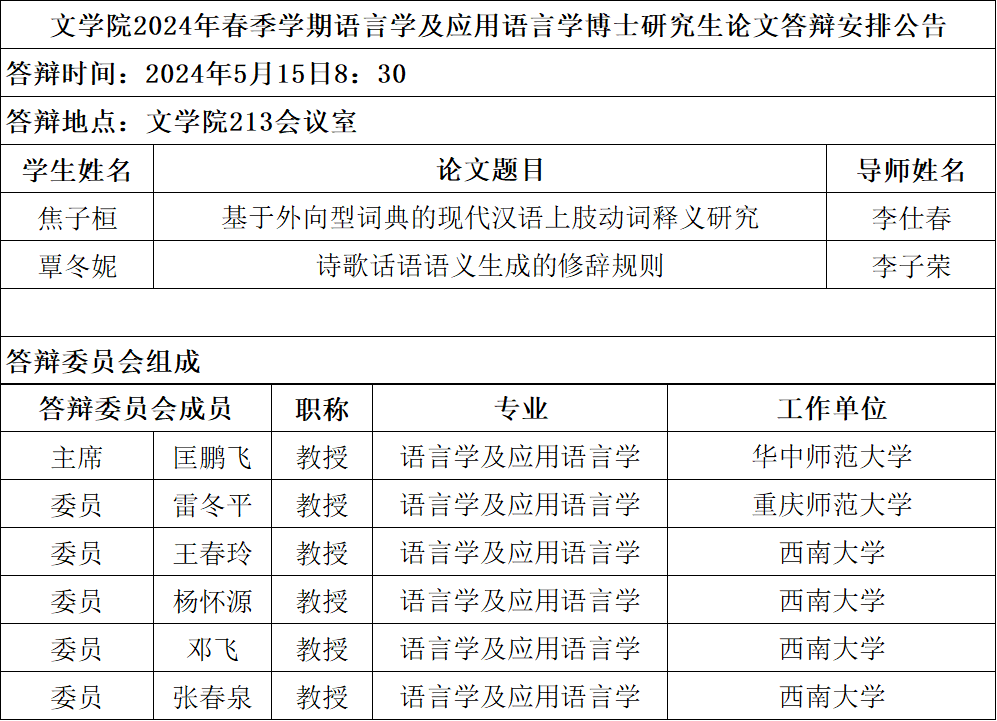 yl7703永利集团2024年春季学期语言学及应用语言学专业博士学位论文答辩安排公告