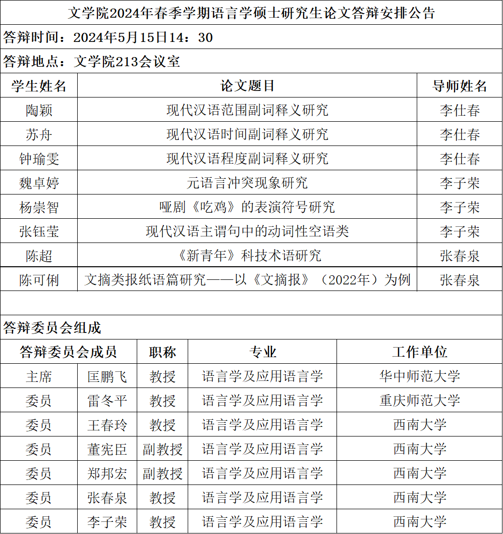 yl7703永利集团2024年春季学期语言学及应用语言学专业硕士学位论文答辩安排公告