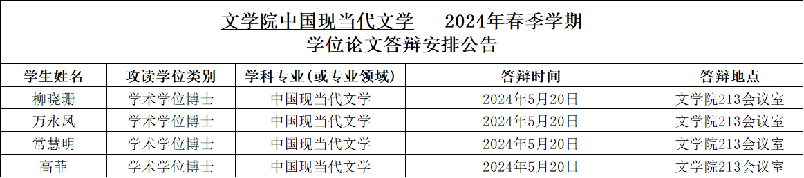 yl7703永利集团2024年春季学期中国现当代文学专业博士学位论文答辩安排公告