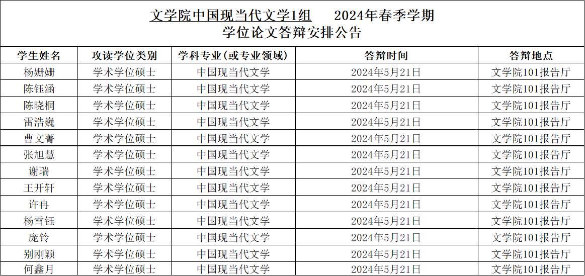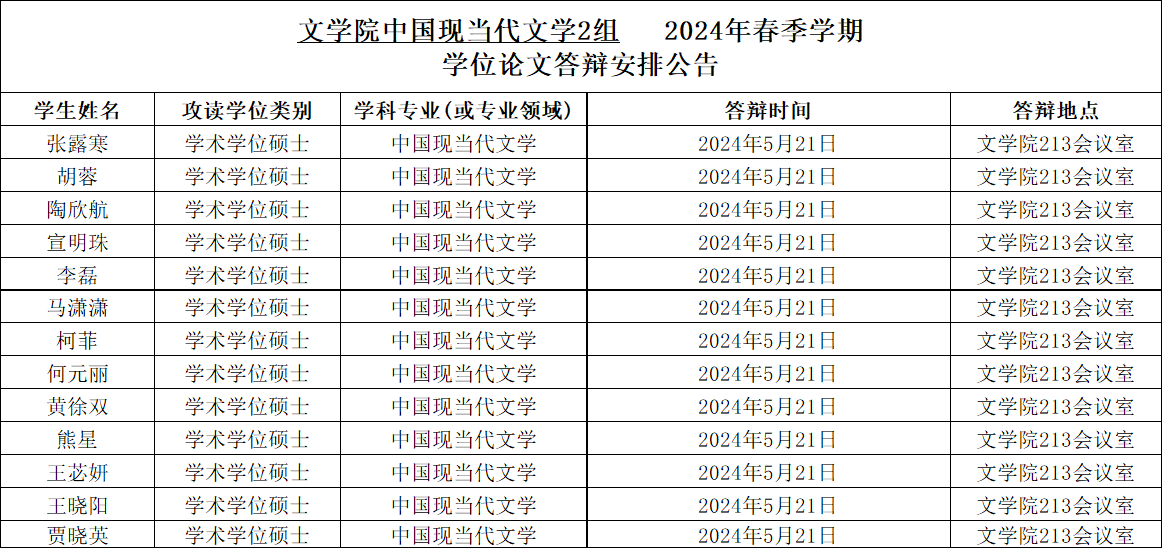 yl7703永利集团2024年春季学期中国现当代文学专业硕士学位论文答辩安排公告