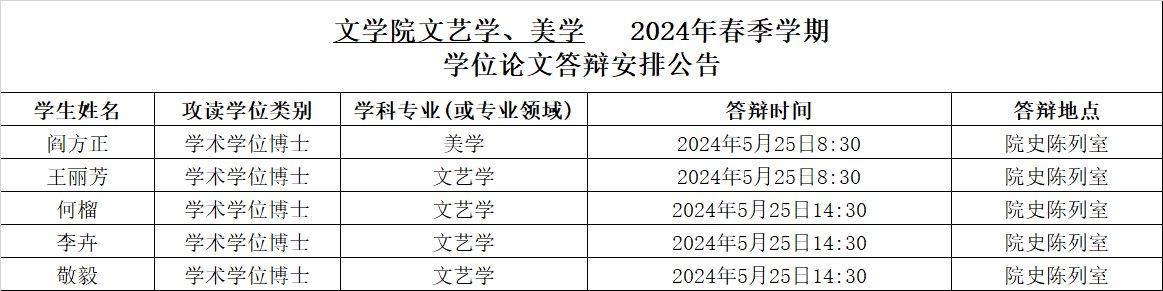 yl7703永利集团2024年春季学期文艺学、美学专业博士学位论文答辩安排公告