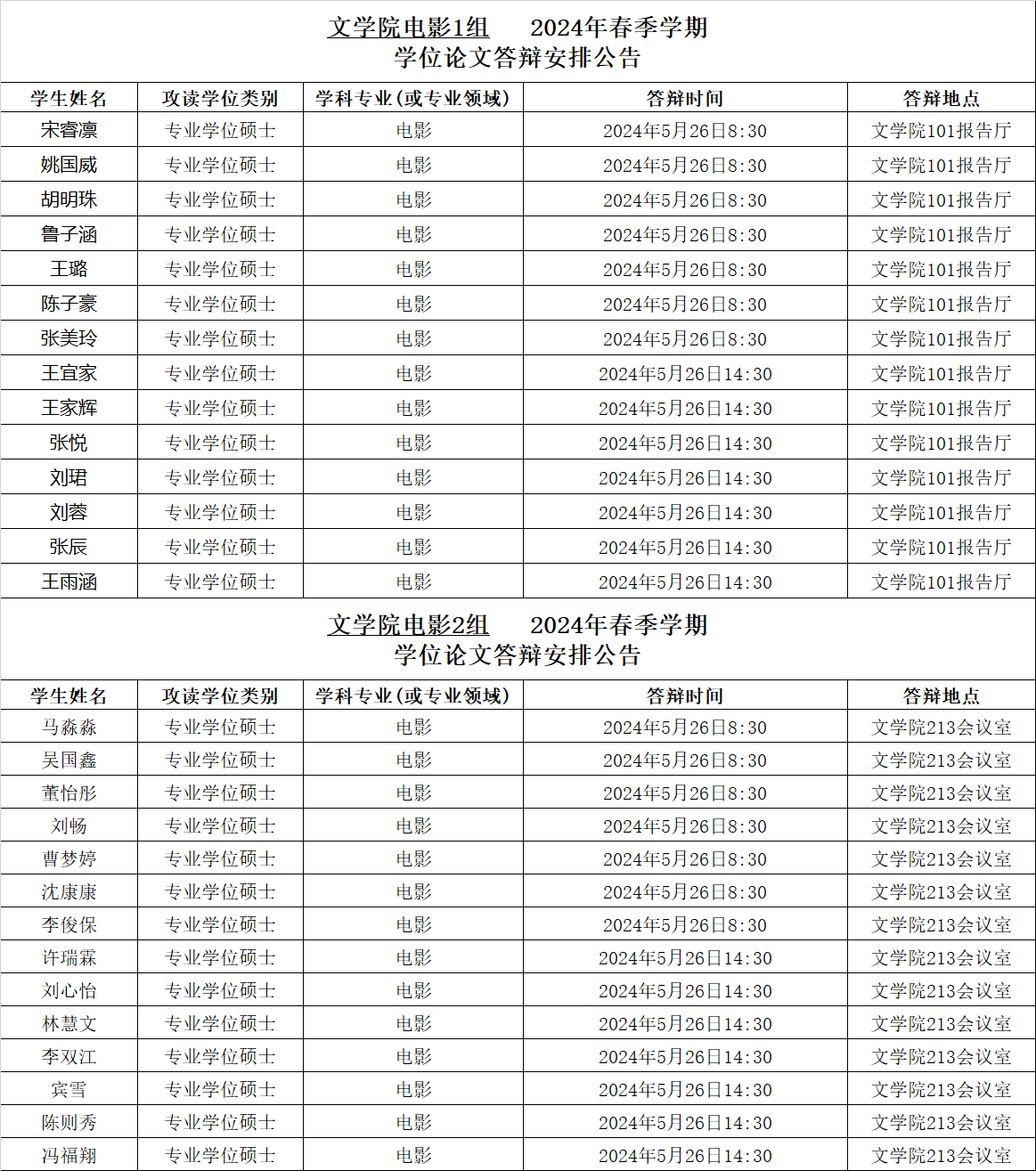 yl7703永利集团2024年春季学期电影专业硕士学位论文答辩安排公告