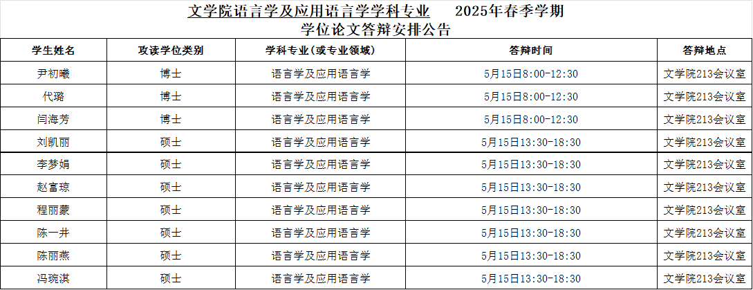 yl7703永利集团语言学及应用语言学专业2025年春季学期学位论文答辩安排公告