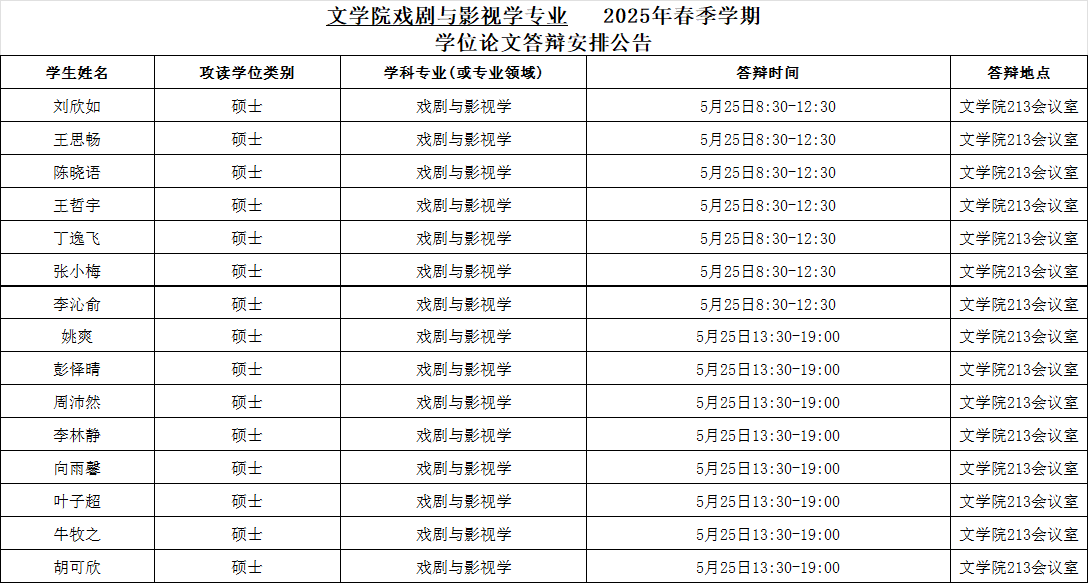 yl7703永利集团戏剧与影视学专业2025年春季学期学位论文答辩安排公告