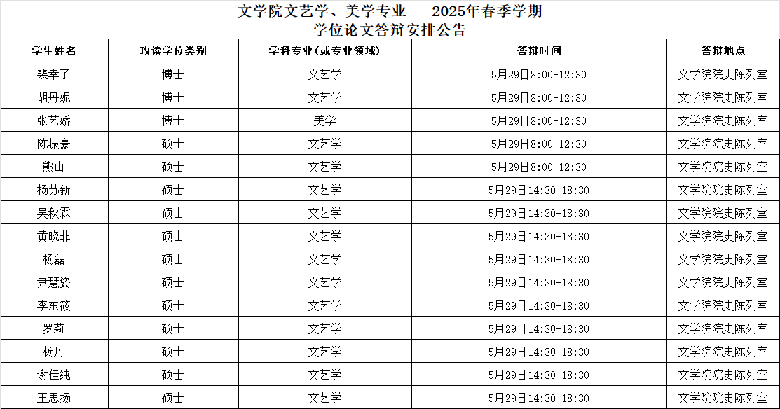 yl7703永利集团文艺学、美学专业2025年春季学期学位论文答辩安排公告
