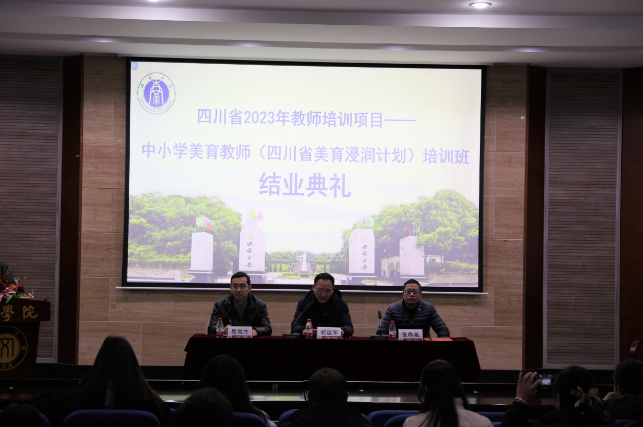 12月15日,yl7703永利集团举行四川省中小学美育教师(美育浸润计划)培训班结业典礼。yl7703永利集团党委书记胡建军、副院长张春泉、培训班班主任易君杰出席典礼。开班典礼由胡建军书记主持。中小学美育教师(四川省美育浸润计划)培训班的全体学员参加典礼。