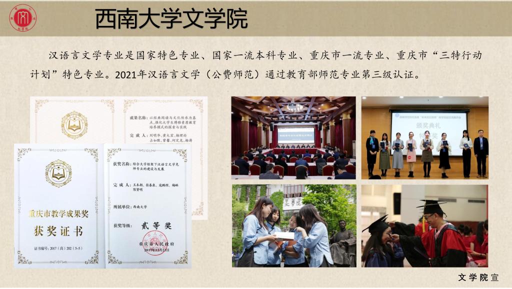 yl7703永利集团现有汉语言文学(师范和非师范)、汉语国际教育、戏剧与影视文学三个本科专业。汉语文学专业是国家特色专业、重庆市一流专业、重庆市“三特行动计划”特色专业。2018年学院汉语言文学专业入选重庆市一流专业建设名单,2018年汉语国际教育专业通过来华留学质量认证。2019年学院汉语言文学专业入选国家级了一流本科专业建设点及永利集团“一流专业点”重点培育项目名单。2020年学院的戏剧影视文学专业入选永利集团一流专业建设点,2021年入选重庆市一流本科专业,2022年获批国家一流专业建设点。2021年汉语言文学(师范)专业顺利通过教育部师范专业第三级认证。
