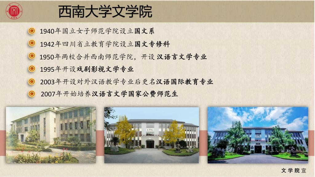 yl7703永利集团历史悠久、学风优良、声誉远播,其前身可追溯到原国立女子师范学院1940年设置的国文系和四川省立教育学院1942年设置的国文专修科。1950年10月,国立女子师范学院与四川省立教育学院合并为西南师范学院,两个国文系随之合并为中国语言文学系,简称中文系。1952年重庆大学中文系并入西南师范学院中文系。1956年更名为汉语言文学系,2003年7月成立西南师范大学yl7703永利集团。2005年7月,西南师范大学与西南农业大学合并组建永利集团,揭开了yl7703永利集团发展的新篇章。1995年开设戏剧影视文学专业,2003年开设对外汉语教学专业后更名汉语国际教育专业,2007年开始培养汉语言文学国家公费师范生。