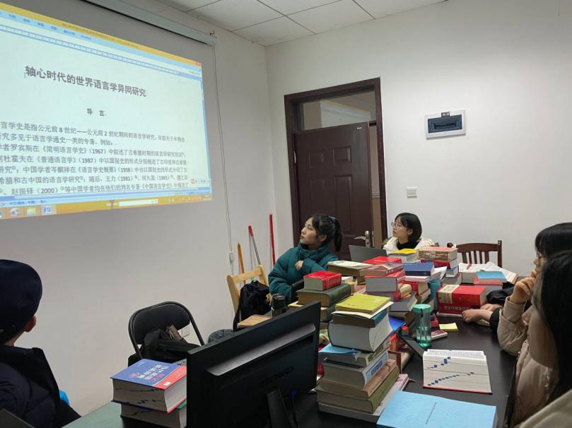 李仕春教授首先提出这样一种词典学现象让大家讨论:多义词的义项在《牛津简明英语词典》(Concise OxfordEnglish Dictionary)、《牛津高阶英语学习词典》(Oxford Advanced Learner's Dictionary)(1948)、《韦氏高阶英语学习词典》(Merriam-Webster's Advanced Learner's English Dictionary)(2012)等英语词典中是按照词性排列的,但在《现代汉语词典》《现代汉语规范词典》《现代汉语学习词典》等汉语词典中则不是按照词性排列义项而是混排的。经过研讨,大家得出如下结论:研究词义衍生时要把关注点放在分析相同词性义项之间的关系上,按照词性排列多义词义项的做法是合乎学理的。博士生研究生焦子桓同学汇报了学术论文《轴心时代的世界语言学异同研究》,硕士研究生王成汇报了学术论文《现代汉语“直”义项分布情况的描写与解释》。