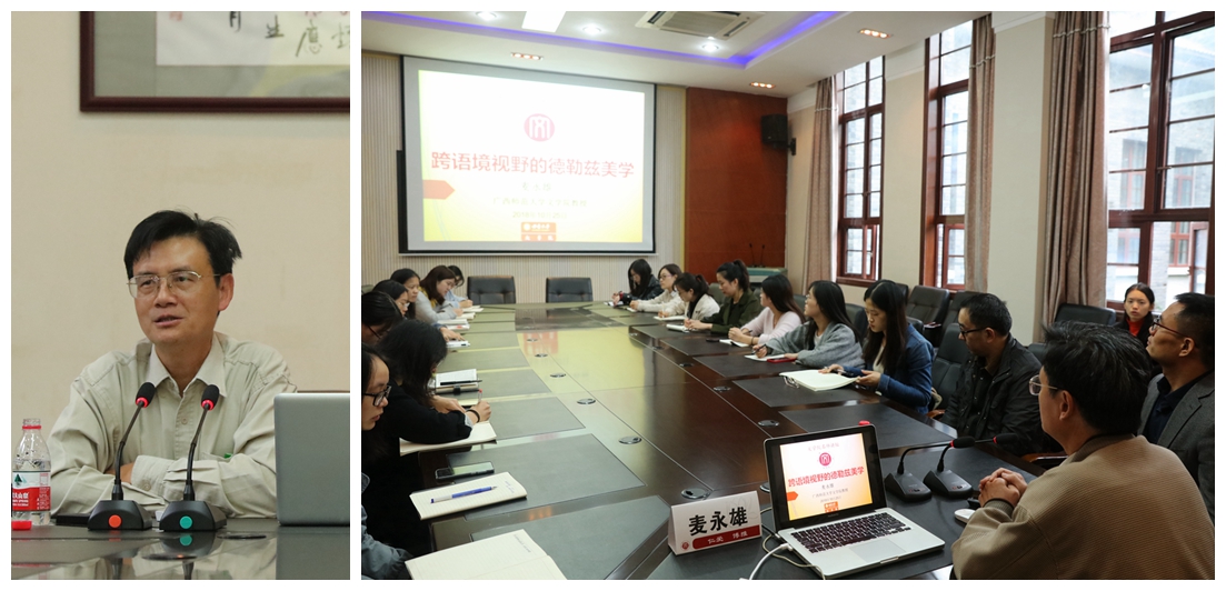 10月25日,广西师范大学yl7703永利集团麦永雄教授做客yl7703永利集团名师讲坛,带了题为“跨语境视野的德勒兹美学”的精彩讲座。讲座由yl7703永利集团比较文学与世界文学教研室主任李应志教授主持,付飞亮副教授出席讲座。现场气氛热烈,师生共赴一场思想盛会。
