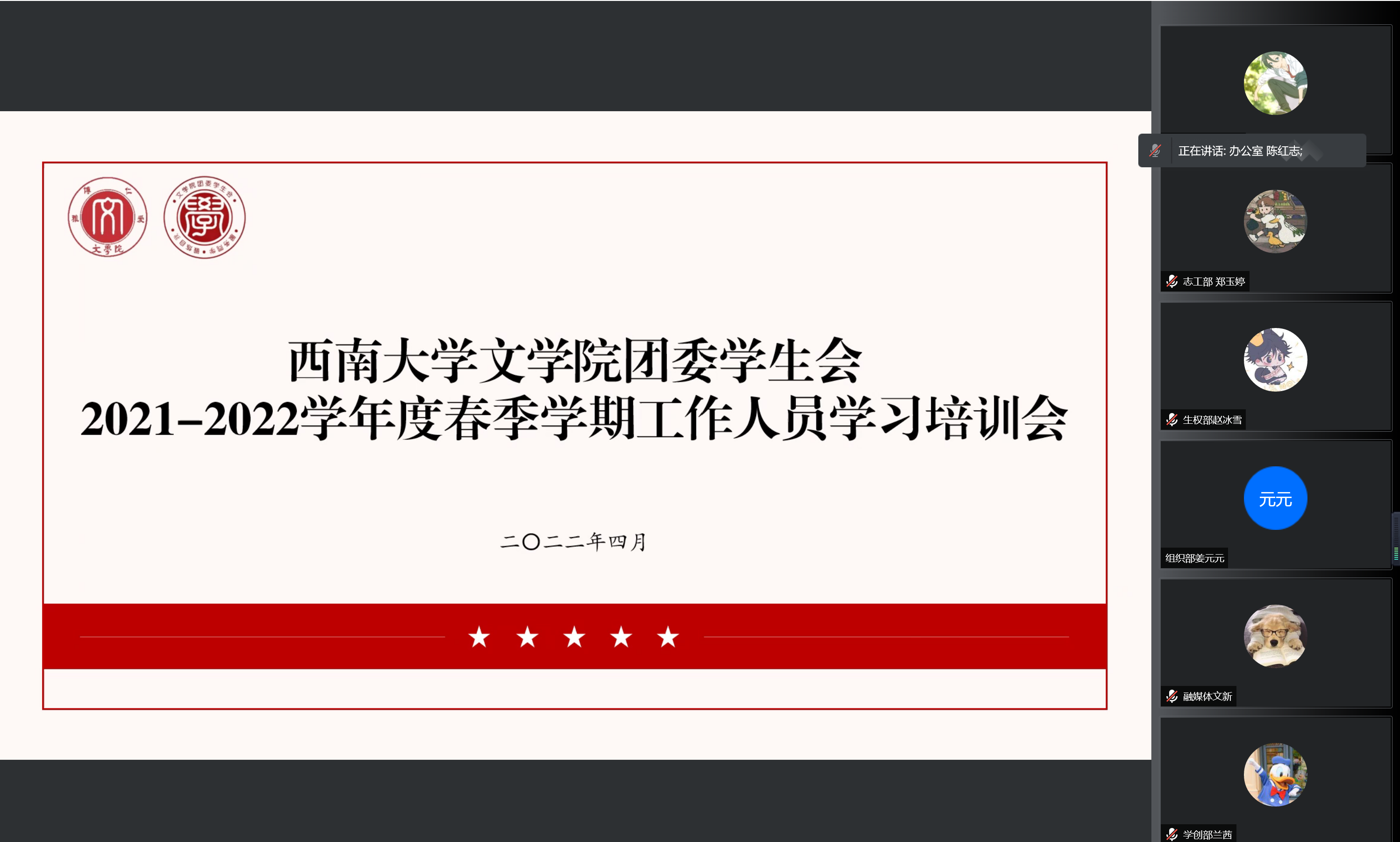 4月1日下午,yl7703永利集团团委学生会线上举行2021-2022学年度春季学期工作人员学习培训会。会议由yl7703永利集团团委学生会艺术团陈红志同学主持,各部门工作人员参会。