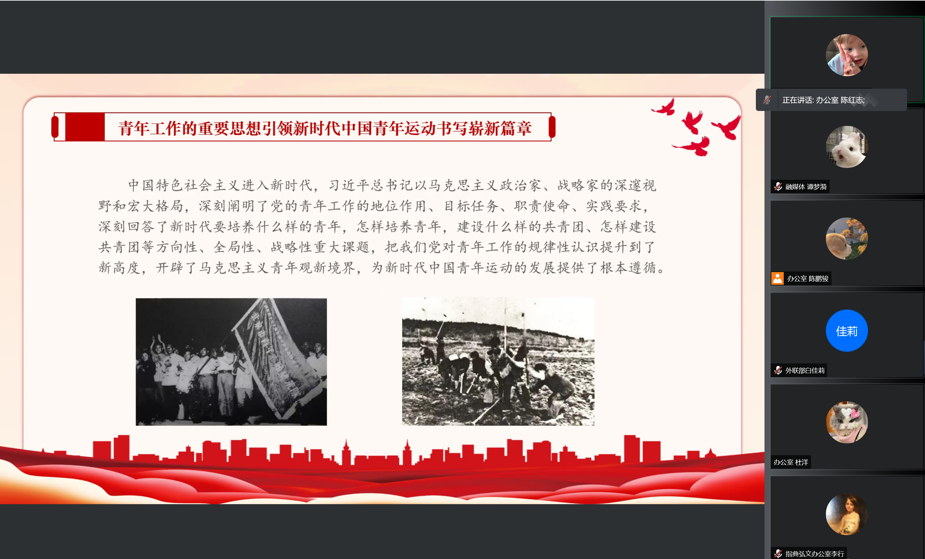 会议第一项议程为“党的青年运动史”,主持人从多个方面带领参会人员学习文章《党领导中国青年运动的光辉历程》。会议第二项议程为观看视频《百年青运史,青春正当时》。视频中的青年为民族独立、国家发展、人民幸福和社会进步踔厉奋发、笃行不怠,具有深刻的教育意义。会议第三项议程为学生代表发言。宋树鸣、冉杏两位同学先后就党的青年运动史学习感想和学生会工作感受两个方面进行了分享。