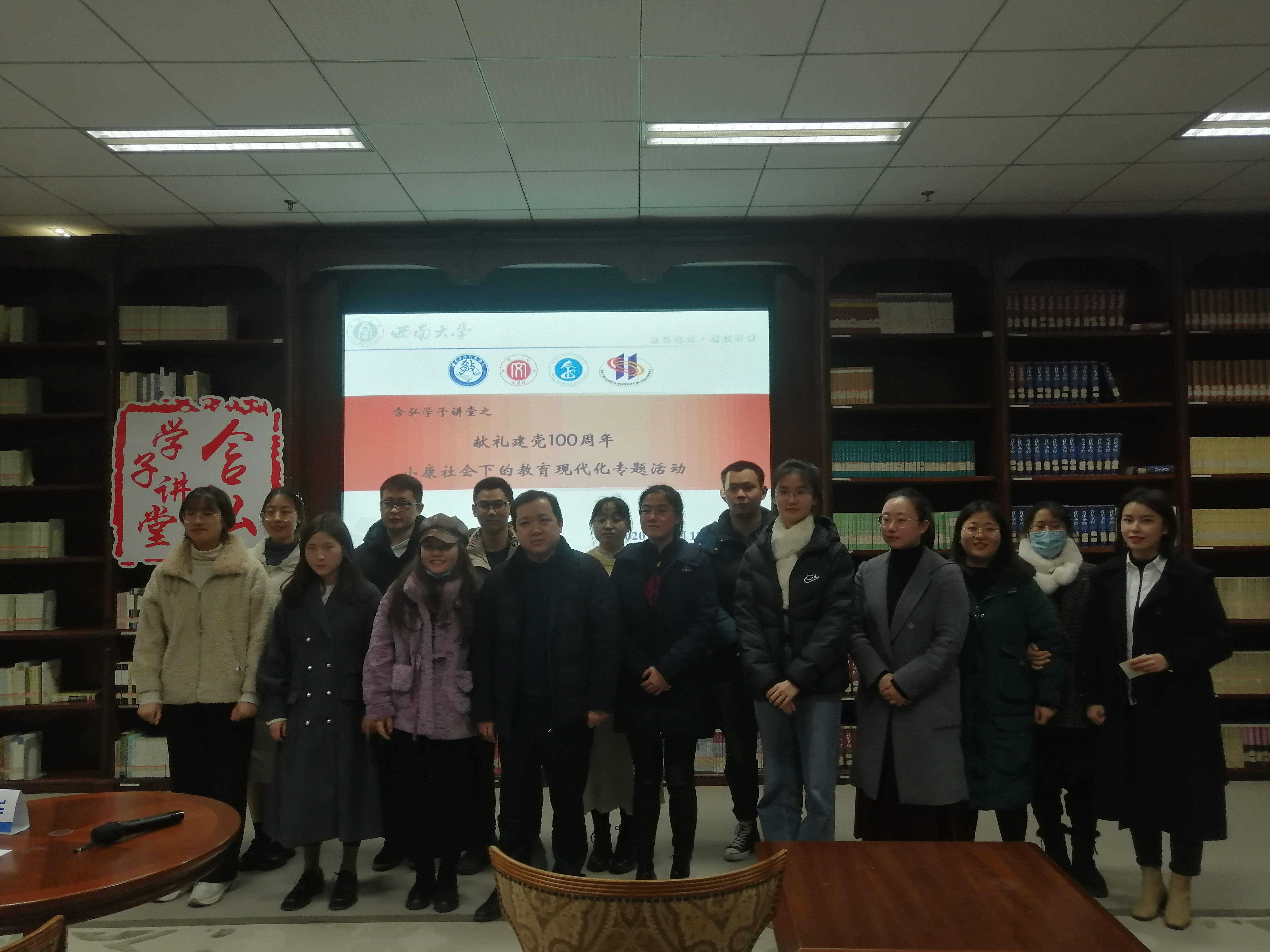 12月18日,由永利集团研究生会主办,永利集团教育学部研究生团总支研究生会、yl7703永利集团研究生会、外国语学院研究生会、西南民族教育与心理研究中心研究生会联合承办的“含弘学子讲堂之献礼建党100周年小康社会下的教育现代化”专题活动在中心图书馆九楼举办。永利集团教育学部副部长王正青教授、西南民族教育心理研究中心副主任罗江华教授担任点评嘉宾,yl7703永利集团2020级古代文学专业研究生肖雪媛同学主持活动。