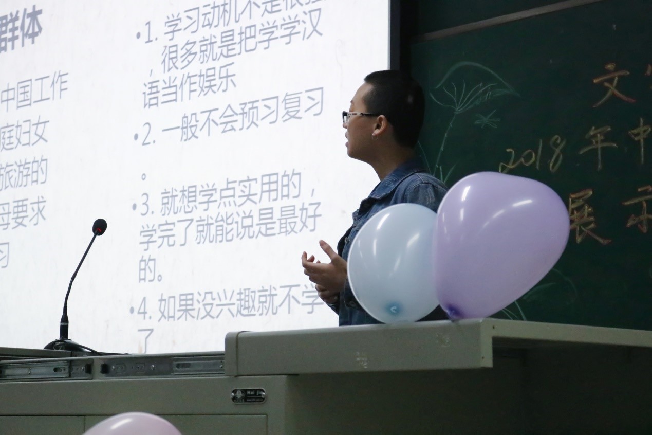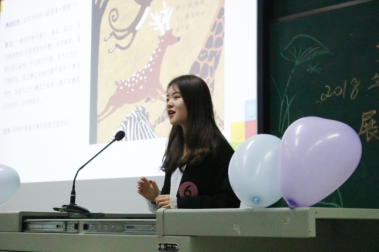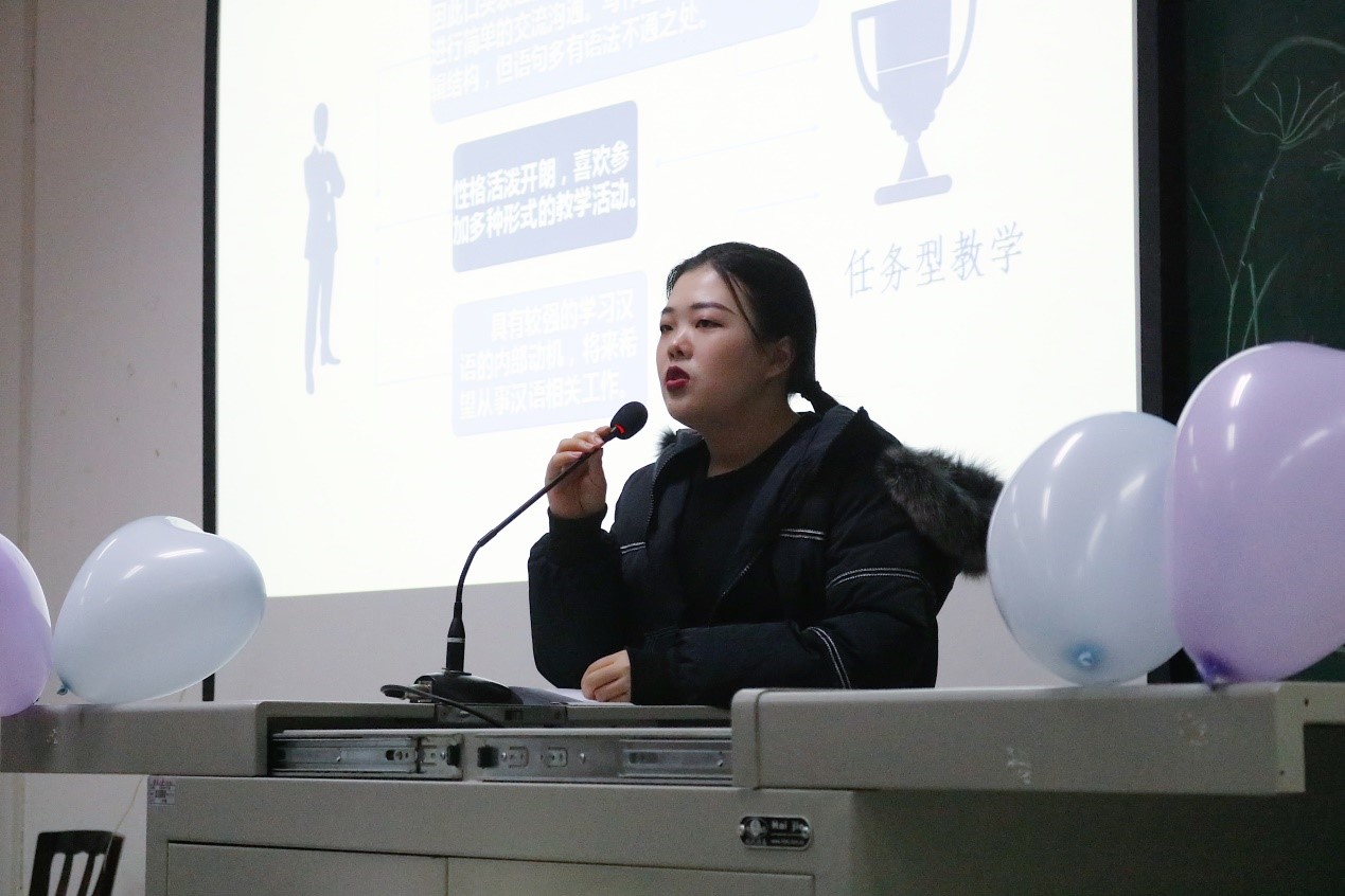 在轻松有趣的小游戏“你画我猜”之后,比赛进入第二赛段,来自汉语国际教育班的中国学生进行PPT展示。5号选手樊凡展示了自己对任务型教学写作教学方面的见解,6号选手刘晨用丰富的图片对成语“狐假虎威”进行教学,7号选手周莉燕介绍了自己对汉语语序的理解和教学设想。选手们精彩的表现赢得阵阵掌声。龙玫老师和毛志萍老师对选手表现进行了细致点评,提出殷切期望,希望大家能承担起汉语教学的时代使命。