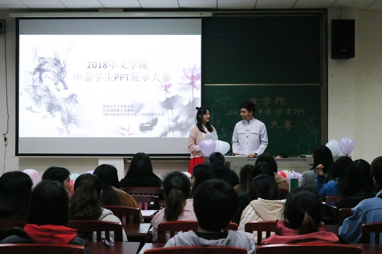 为纪念yl7703永利集团中泰合作办学十周年,展示yl7703永利集团国际化办学成果,为中泰学生提供展示风采和锻炼自我的舞台,yl7703永利集团于11月30日举办了中泰学生PPT展示大赛。本次活动由yl7703永利集团主办,2016级汉语国际教育班承办,2017级汉语国际教育班协办。yl7703永利集团汉语国际教育系张旭东老师、李娟老师、龙玫老师和毛志萍老师担任专业评委,2016级和2017级汉语国际教育班学生担任大众评委。董雪吟同学与泰国留学生王伟同学主持本场比赛。