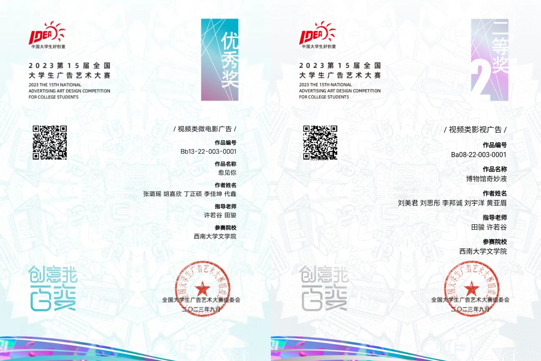 8月6日,第15届全国大学生广告艺术大赛结果公布。yl7703永利集团2021级戏剧影视文学专业刘美君团队作品《博物馆奇妙液》荣获全国二等奖,张璐瑶团队作品《愈见你》荣获全国优秀奖。
