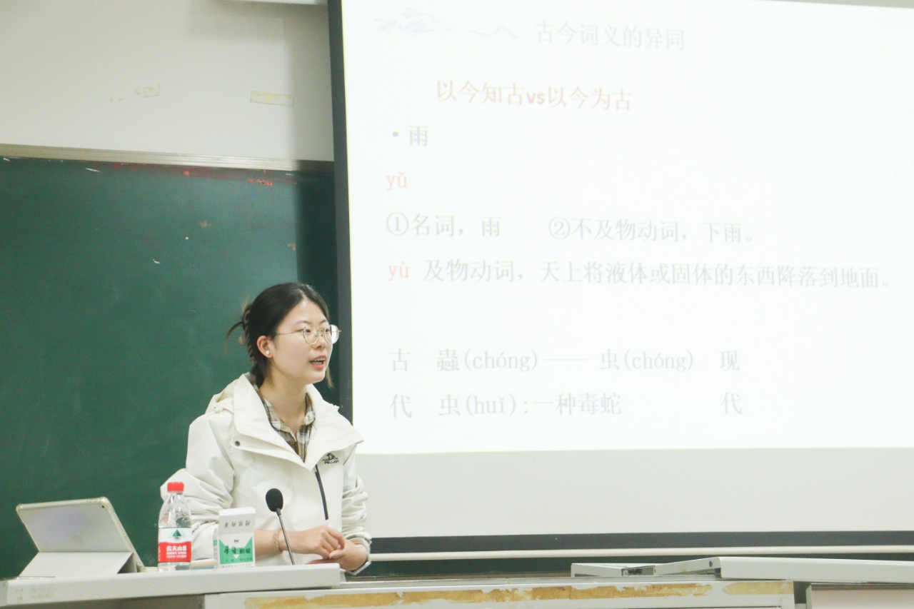 在11月3日的活动中,刘奕菲同学对先秦文学进行框架梳理,通过横向比较中西方神话的异同,详细讲述了《诗经》部分的要点。赵秉珠同学带领大家探索古今词义的演变过程,分析部分词义变化显著的字,区分假借义与引申义的不同,还介绍了研究词本义的多种途径。