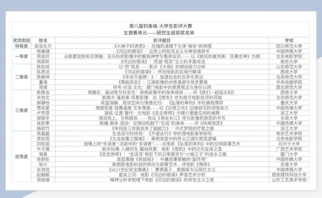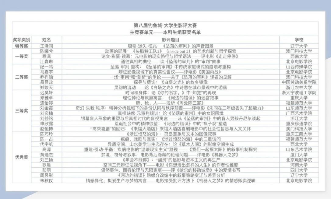 yl7703永利集团学子积极参与并获得多个奖项。2021级戏剧影视文学专业程潇以影评《论文·彩蛋·镜幕:元电影的现实路径与哲学语法——评电影<走走停停>》获主竞赛单元本科生组一等奖;2023级戏剧影视学专业陈姝含以影评《再魅化、能动性与社会化:疾病叙事中的身体修辞——评<我们一起摇太阳>》获主竞赛单元研究生组三等奖;2023级电影专业王聪、2023级戏剧影视文学专业曹馨文、杨舟获入围奖。