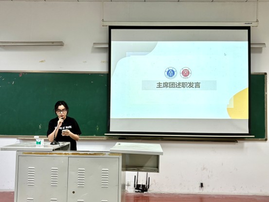 最后,第十七届研究生会全体成员依次进行述职汇报。各成员立足岗位职责,系统总结了本学期各项工作开展情况,并分享了在活动组织、团队协作等方面的成长收获。述职过程中,大家既客观分析了工作中存在的不足,又结合自身经验对研会制度建设、活动创新等方面提出了建设性意见。