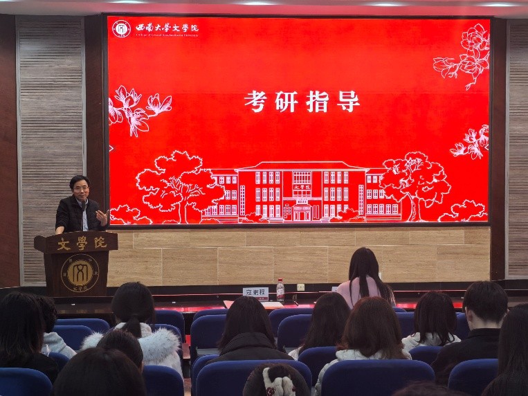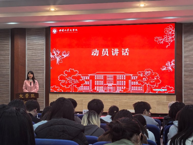 随后,2025届汉语言文字学专业陈红志同学作为往届考研代表,结合自身经历作经验分享。她从院校选择、时间规划、分科备考等方面系统梳理了备考要点,建议同学们尽早确定目标、合理分配时间、善用网络资源,保持平稳心态。最后,2027届考研学生代表何彦蓉同学分享备考心路。她号召同学们不惧迷茫焦虑,在每一个疲惫时刻仍能翻开书本、继续前行,以中文人特有的理想与坚韧迎接这场挑战。