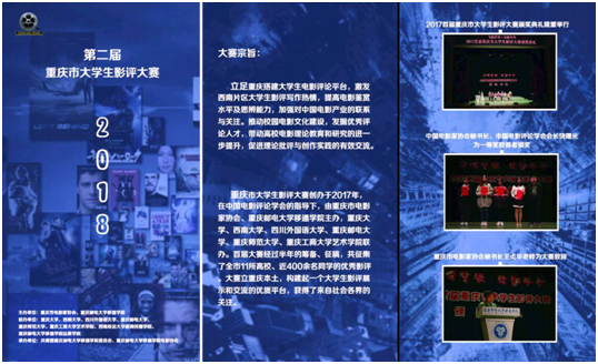 重庆市大学生影片大赛创办于2017年,在中国电影评论学会的指导下,由重庆市协主办,首届大赛经过半年的筹备征稿共征集11所高校的优秀影评。大赛立足重庆本土,构建其一个大学生影评展示和交流的优质平台,获得了来自社会各界的关注。