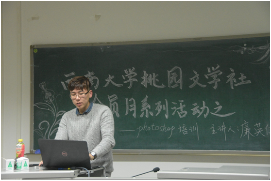 2017年11月4日晚七点,永利集团桃园文学社于第二十六教学楼211教室举行第一期会员系列活动——PS培训,主讲人是来自计信院的廉英健学长。