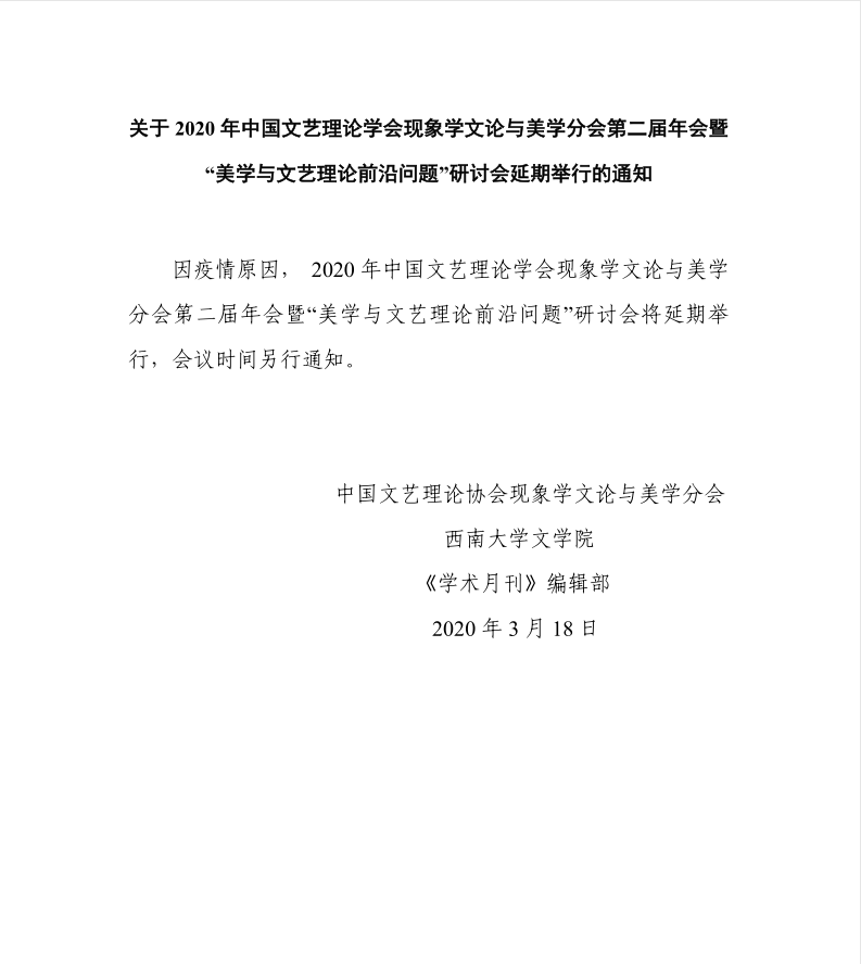关于2020年中国文艺理论学会现象学文论与美学分会延期举行的通知