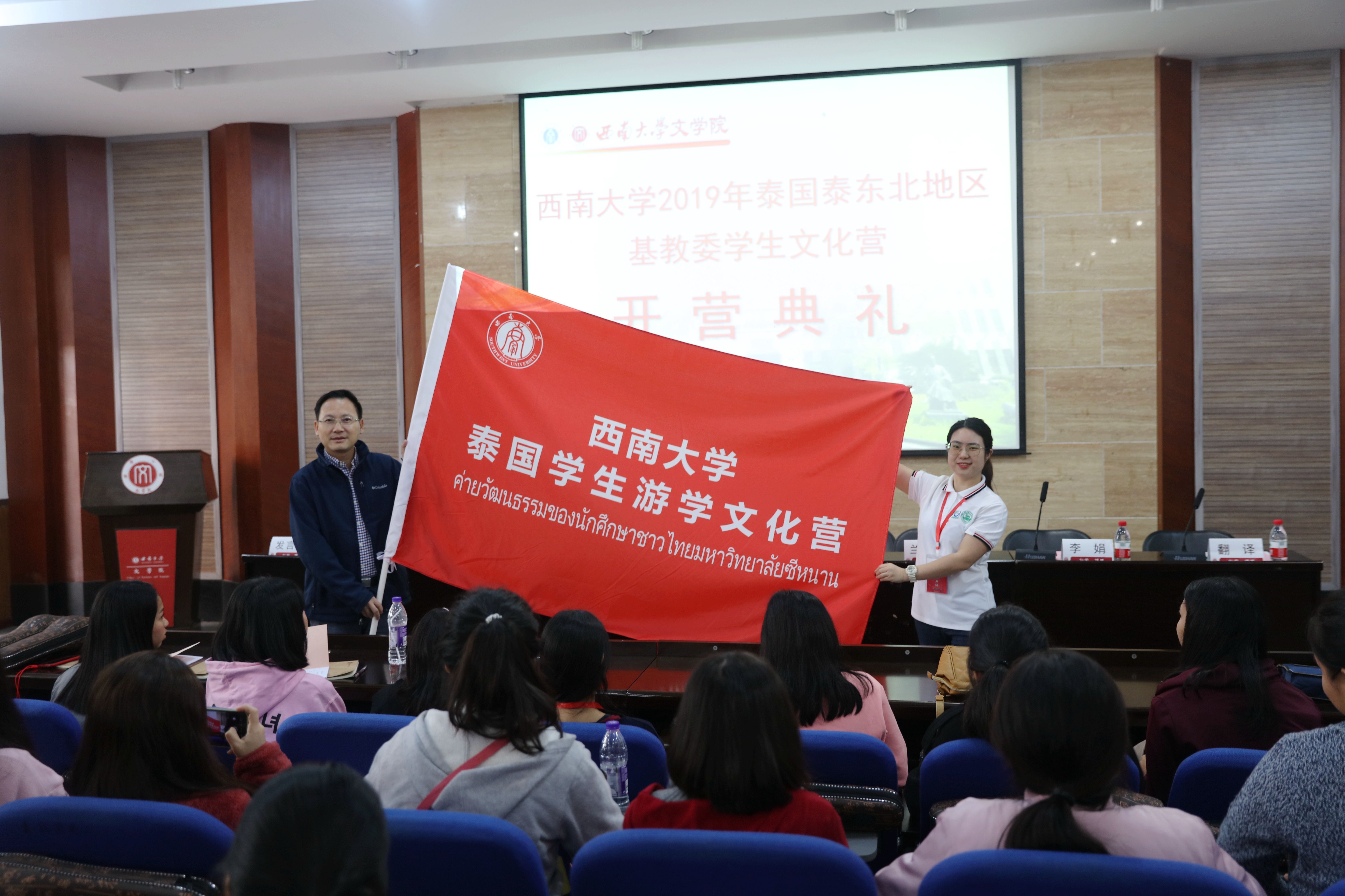 谭婷月老师代表泰方向yl7703永利集团赠送纪念品,胡建军书记和陈炳君副处长为全体营员赠送中国传统乐器葫芦丝。胡建军书记为本次文化营授营旗。