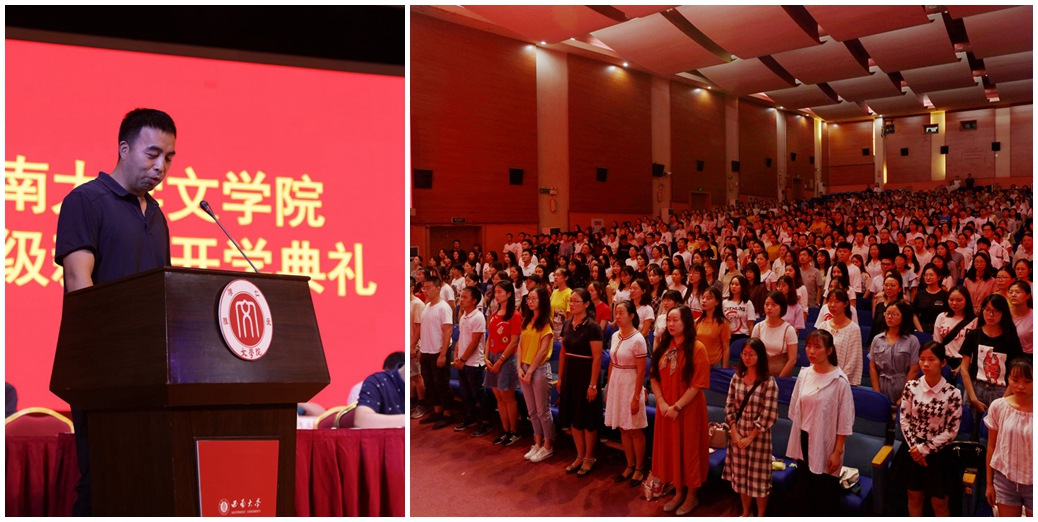 院长王本朝教授发表致辞并代表全院师生员工向新生们表示热烈欢迎,随后介绍了学院的历史渊源、大家名师、学科发展、师资力量和专业设置等方面的情况。王本朝院长寄语全体2019级新生:一是确立大学阶段的人生目标。没有目标的人生如同没有航标的小船,随时就会面临危险。人生需要目标来引领,同学们要珍惜时光,脚踏实地,做好自己该做的事情;二是不但要知道,更要有行动。一旦确立了人生目标,应该不计时间,不计得失,坚持下去,总会有成功的时候。不要急于求成,不要等机会和靠运气,要老老实实做自己的事情;三是努力练就过硬的中文本领。让自己有语言的材料和感悟,有文学的味道和情怀。要培养丰富的文学经验,留下一段美好的人生记忆。要多读文学经典,多涉猎历史、哲学文化等著作。王本朝院长勉励大家磨砺品格,砥砺意志,增长才干,用实实在在的努力去谱写无悔的青春岁月。