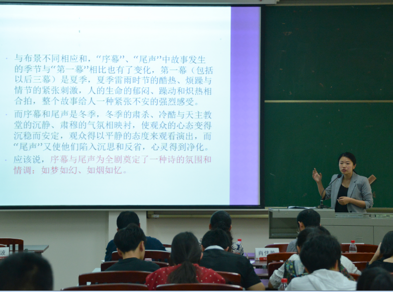寇鹏程老师深入剖析了儒学开创者孔子“仁”“爱”“美”的中国美学理念;刘建平老师选取西方美学的角度,从悲剧概念和悲剧主角性格两个方面阐释了亚里士多德的悲剧理论;张纯静老师通过分析公文文种乱用的现象,就公告与通告的区分要点进行了讲解;姜永琢老师详细讲解了艺术的内容与形式;付佳奥老师对晏几道的《临江仙·梦后楼台高锁》进行了赏析,诗词意境引人入胜;梅琳老师剖析曹禺的经典作品《雷雨》,阐释该四幕悲剧中序幕与尾声的作用;刘帆老师从剧作的几个关键问题入手,解密影视剧作中“突转——发现”等创作技巧;郭帅老师解读了文学巨匠莫言的作品,探究莫言作品中的文学魅力;刘洁老师另辟蹊径,讲解了《水浒传》中的女性恶观;刘叙武老师以在我国戏曲历史上有重要地位的昆剧声腔的由来为切入点,讲解了明初南戏四大声腔;王小惠老师由浅入深的阐释了《骆驼祥子》中祥子的性格转变;李子荣老师从“什么是语言?”这一问题引入,带来了生动多彩的“语言学概论”课。
