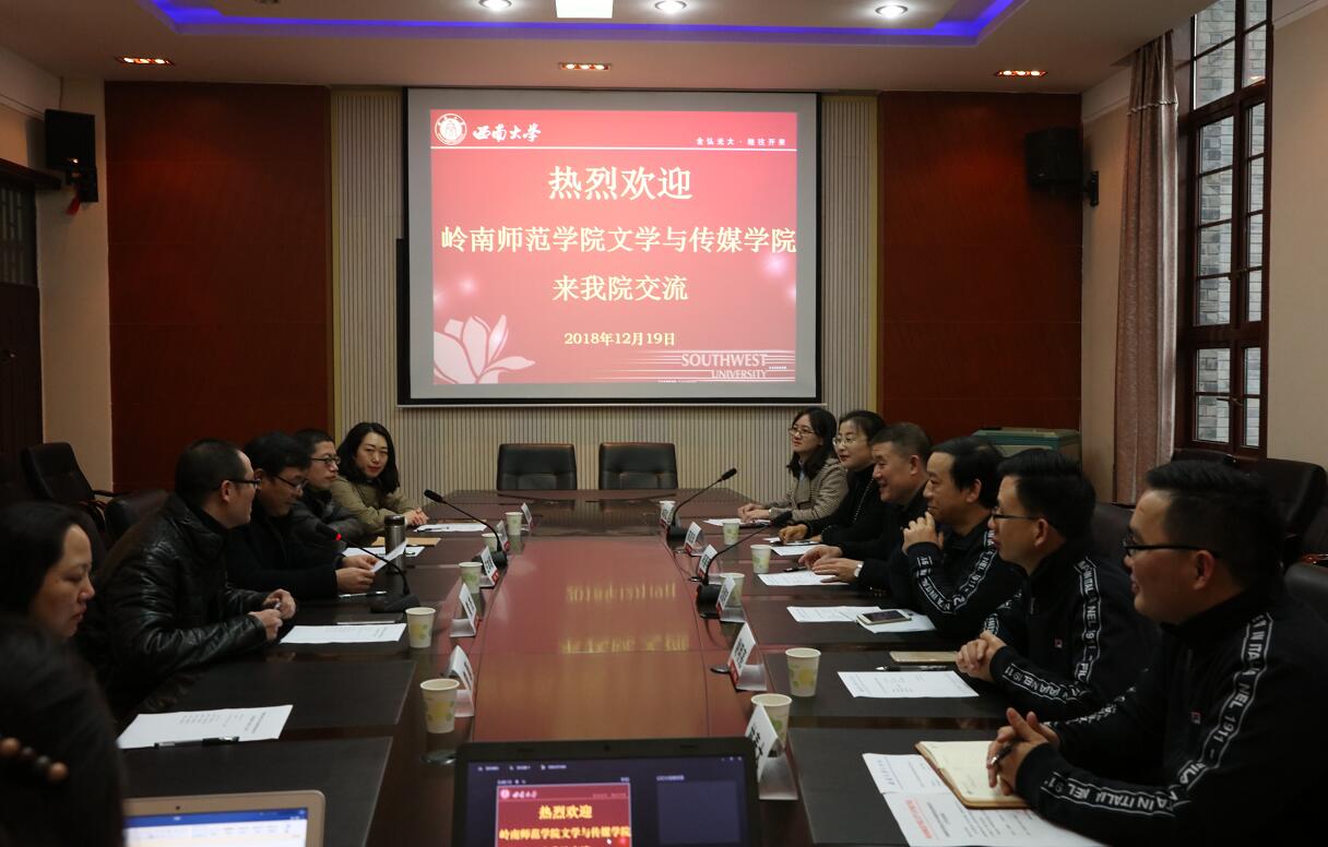 黄杰书记首先代表学院向岭南师范学院文学与传媒学院党委柯春明书记一行的到来表示热烈欢迎,随后,黄杰书记就学院以文化人创特色、国学季风树品牌、高校教育出水平,实行专任教师班主任制度、教授午餐会等制度、搭建专任教师与学生培养之间的沟通平台,促进学生高素质发展等工作做了相关介绍。随后,王本朝院长就yl7703永利集团办学历史、学院现状、学科建设和发展前景等情况做了相关介绍。王本朝院长表示,希望双方立足师范院校特色,加强交流合作,积极探索提升人才培养能力模式,促进教学科研更好发展。