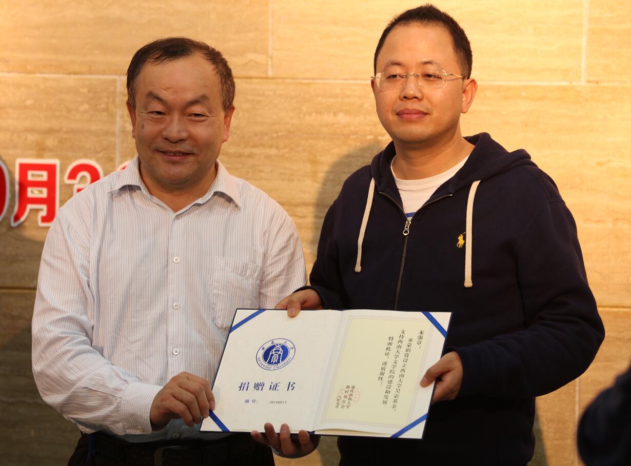 捐赠方代表、原西南师范大学中文系92级校友、重庆中山文化产业投资有限公司董事长张直表示,难忘学校、学院、老师对我们的培养、帮助,捐赠“吴宓基金”,寄托着我们的文学精神、文院情怀,希望更多优秀的师弟师妹们在“吴宓基金”助推下,畅游学海,励志人生。
