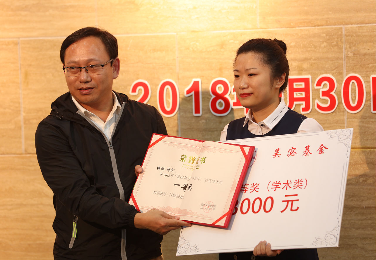 获奖学生代表梅琳、郭大章先后发言,对yl7703永利集团师兄师姐们捐赠“吴宓基金”表示感谢,表示将在今后的学习、工作、生活中继续拼搏努力,奋发有为,将西大精神、文院精神、吴宓精神发扬光大。