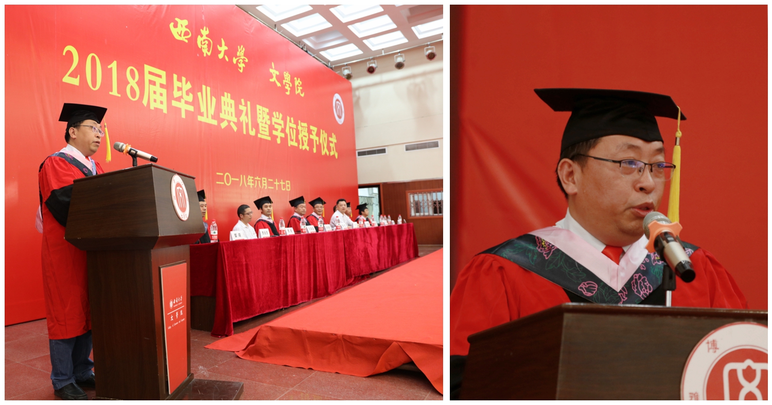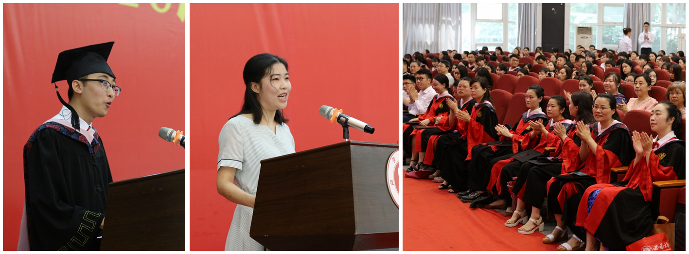 毕业本科生代表、14级汉语言文学师范专业张鹏,毕业研究生代表、2015级中国现当代文学专业危明星分别发言。张鹏同学在校期间,在全国中文核心期刊《中学语文教学》发表教学设计《学学讲道理》,斩获教育部“网络文明,你我同行”主题辩论赛全国总冠军、长安福特杯 2016中国高校汽车辩论赛年度总决赛冠军、第八届全国中华辩论联赛A级赛亚军,获得国家级奖项3个,省区级奖项5个,校级奖励十余项,所策划的微党课获得2017年教育部“全国高校”两学一做支部风采活动微党课特色作品。危明星同学回顾了自己在yl7703永利集团7年时间的成长,并分享了自己在研究生生涯的两点最大感受:一是要笃定,坚定求学方向,敢走清修之路:二是要踏实,一点一滴积累,日复一日思考。