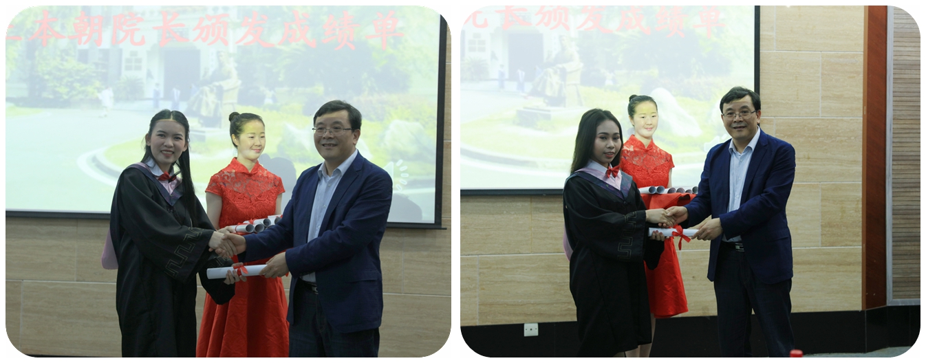 满堂祝福语,皆赠学子行。中泰双方校领导互换礼物,表达了彼此诚挚的谢意和继续携手促进汉语国际教育的决心。伴随着庄严的音乐声响起,王本朝院长为泰国留学生们颁发毕业证书,为泰国留学生们在西大的求学之行画上圆满句号。