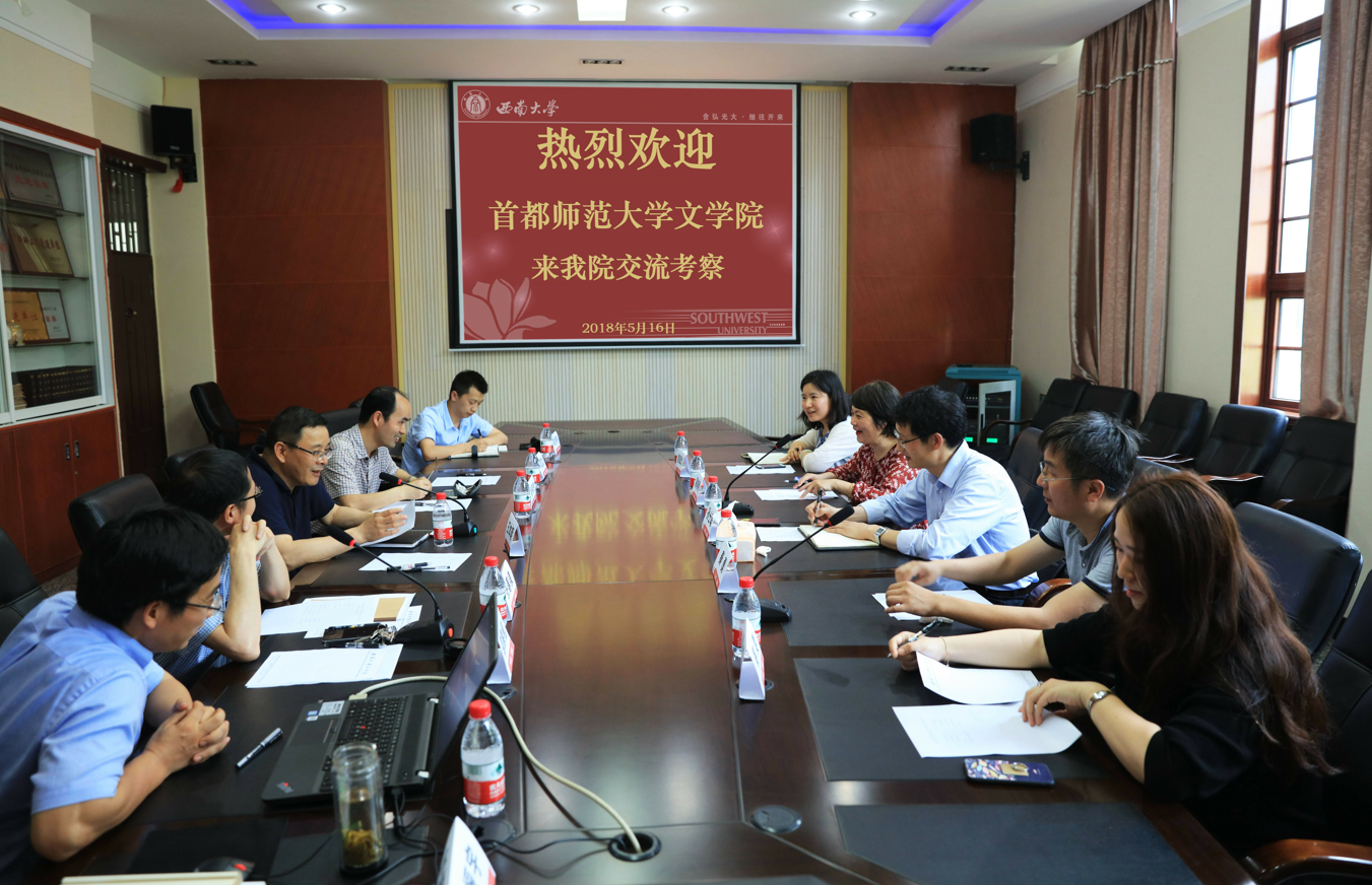 5月16日下午,首都师范大学yl7703永利集团副院长孙士聪、文化产业管理专业负责人秦勇、比较文学与世界文学教研室主任易晓明、“大学语文”骨干教师蔡雯、本科教务办主任黄翠华一行来我院交流考察。yl7703永利集团院长王本朝、院党委副书记何定龙、副院长肖伟胜、副院长张春泉、国家精品课程负责人寇鹏程教授参加座谈交流会。