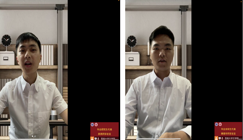 研究生毕业生代表郝尧、本科生毕业生代表黄德华先后发言。郝尧回忆大学生活与支教经历,感念师恩,感激母校。黄德华分享自己如何追逐梦想和成长为一名教师的思考与实践,希望所有毕业生坚定逐梦,执着奋斗。