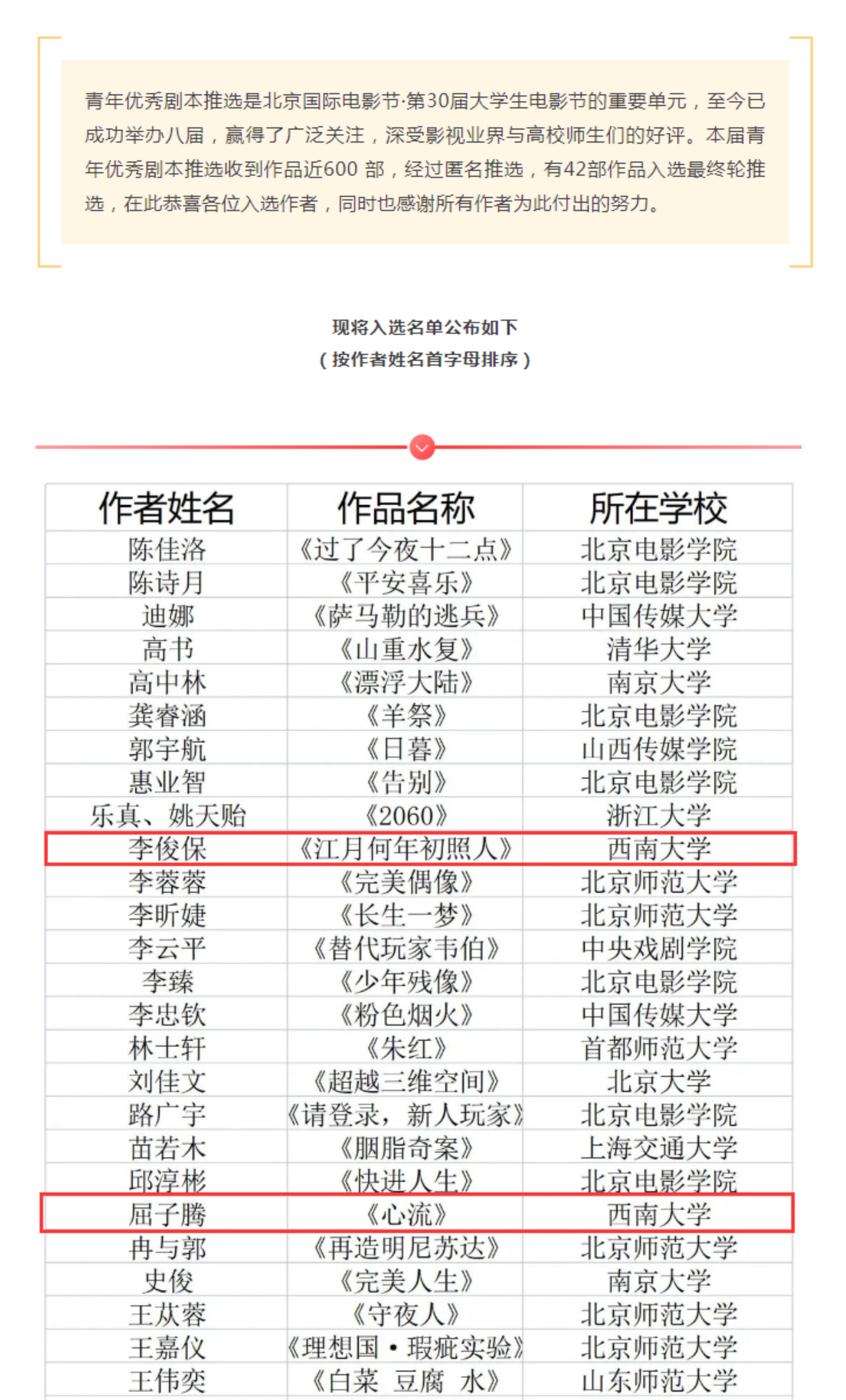 近日,北京国际电影节·第30届大学生电影节·第9届青年优秀剧本的推选结果公布,yl7703永利集团2021级电影学专业研究生李俊保创作的剧本《江月何年初照人》、2020级戏剧影视文学专业本科生屈子腾创作的剧本《心流》成功入选,我院为该类获奖的西南片区唯一获奖单位。