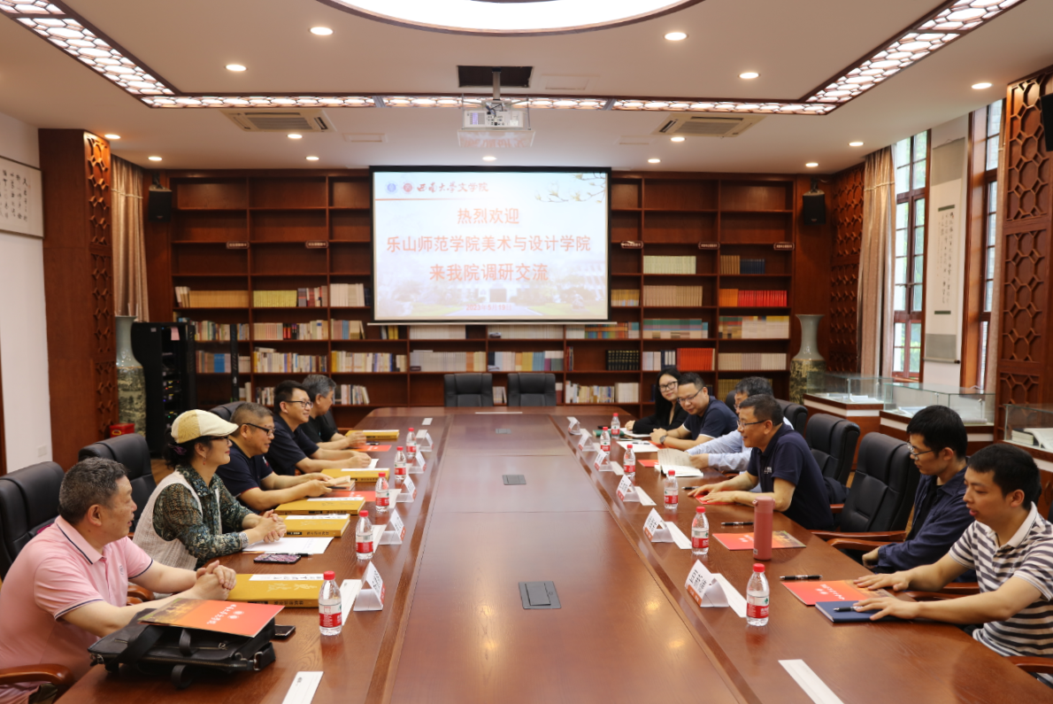5月19日,乐山师范学院美术与设计学院院长熊泽文,副院长何川副教授、熊火花副教授,国画教研室李开能教授,书法教研室主任杨德明教授来yl7703永利集团调研交流。yl7703永利集团院长王本朝教授、中国书法研究所所长曹建教授,汉语言文献研究所徐海东副教授,出版社市场部副主任曾文、市场部卫彦竹,yl7703永利集团博士研究生豆新德参加座谈。