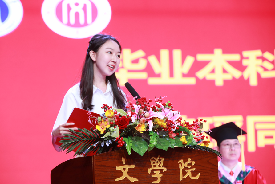 教师代表王小惠教授嘱咐毕业生将读书、读人与阅世结合起来,努力建构一个开放的“自我”。勉励大家担当责任,砥砺前行;开阔心胸,幸福度日;铭记“含弘光大,继往开来”的校训,守住初心,坚持有一分热发一分光。
