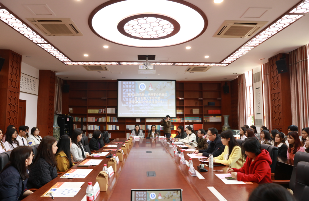 11月20日,泰国孔敬大学校长助理阿查拉婉·托帕娜姆率孔敬大学理事会代表团一行来到yl7703永利集团看望两校联合培养的泰国留学生,并与本院师生代表亲切座谈。