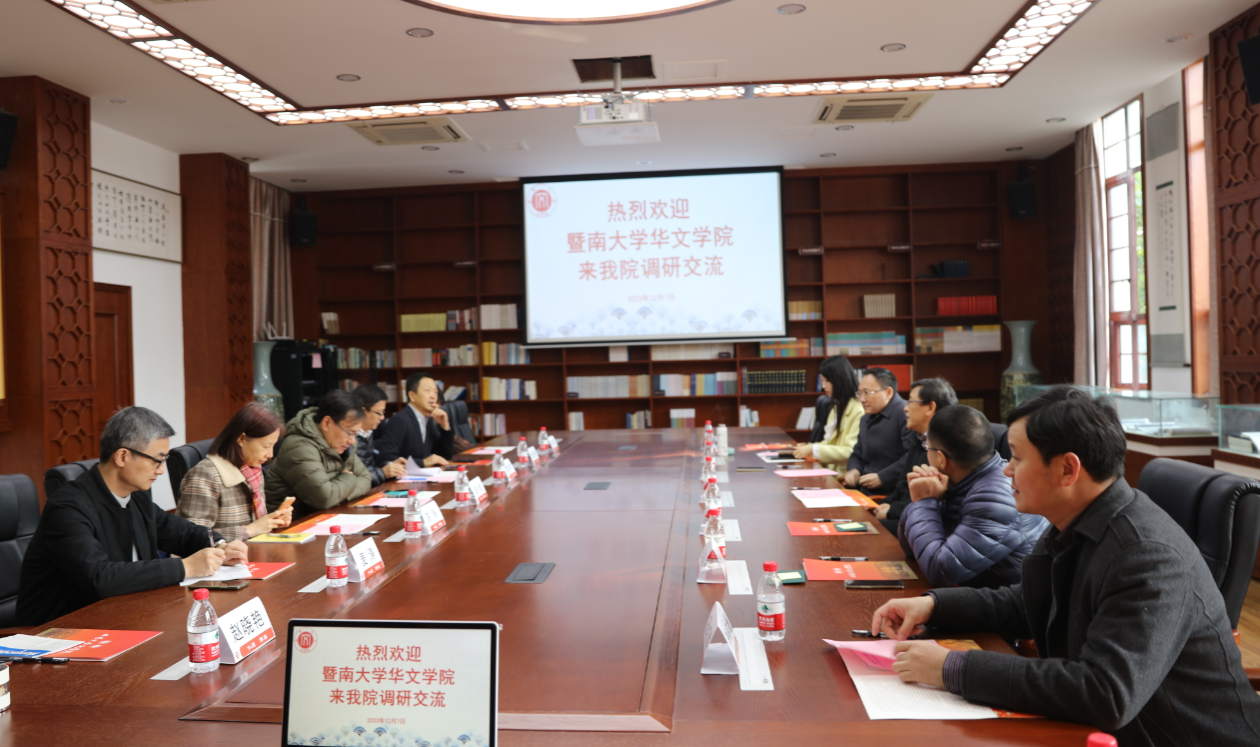 12月7日,暨南大学华yl7703永利集团党委书记谢煊、研管办主任曹钦明、应用语言学系党总支书记陈争、应用语言学系主任李计伟、应用语言学系副主任麦涛、汉语系副主任林奕高、应用语言学系行政秘书赵晓艳来yl7703永利集团调研交流。yl7703永利集团院长王本朝、党委书记胡建军、党委副书记 纪委书记陈玥、党委副书记陈雨曦、副院长张春泉、汉语国际教育系主任毛志萍、汉语国际教育系副教授孙红举参加座谈交流,会议由张春泉副院长主持。