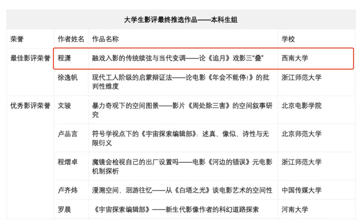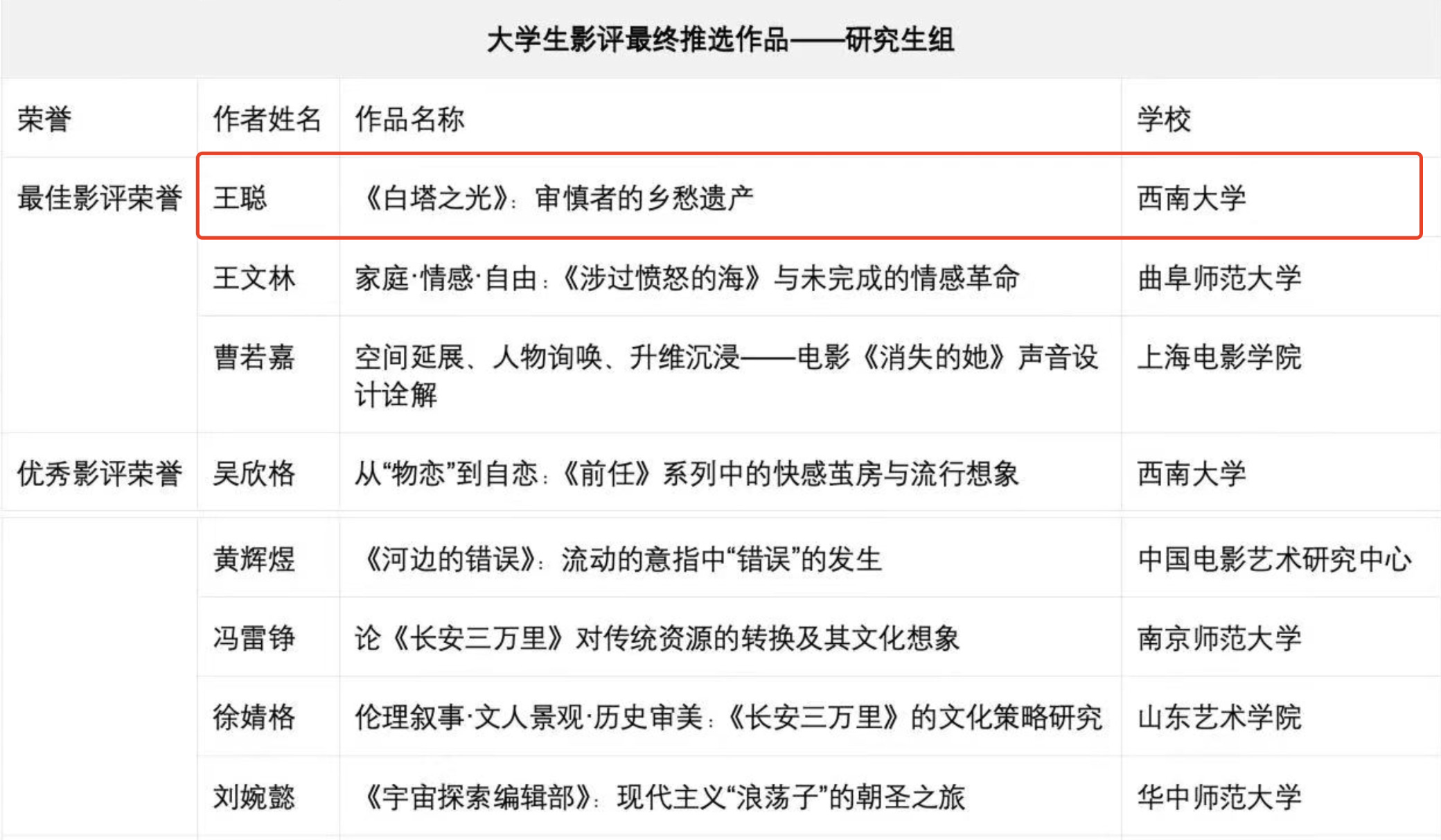 2024年4月28日,“北京国际电影节·第31届大学生电影节”主办方公布2024年度大学生影评推送结果,yl7703永利集团徐爽副教授指导的2021级戏剧与影视文学专业本科生程潇的作品《融戏入影的传统续弦与当代变调——论〈追月〉戏影三“叠”》荣获本科生组最佳影评荣誉;2023级电影专业王聪的作品《<白塔之光>:审慎者的乡愁遗产》荣获研究生组最佳影评荣誉。