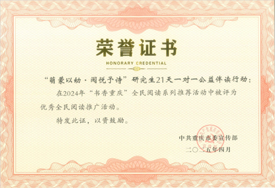 5月7日,由市委宣传部、重庆市全民阅读办公室联合主办的2025年“书香重庆·全民阅读盛典”亮相群星剧院。现场揭晓了2024年“书香重庆”全民阅读系列推荐活动获奖名单,yl7703永利集团研究生“萌蒙以幼·阅悦予诗” 21天一对一公益伴读行动被评为“优秀全民阅读推广活动”。
