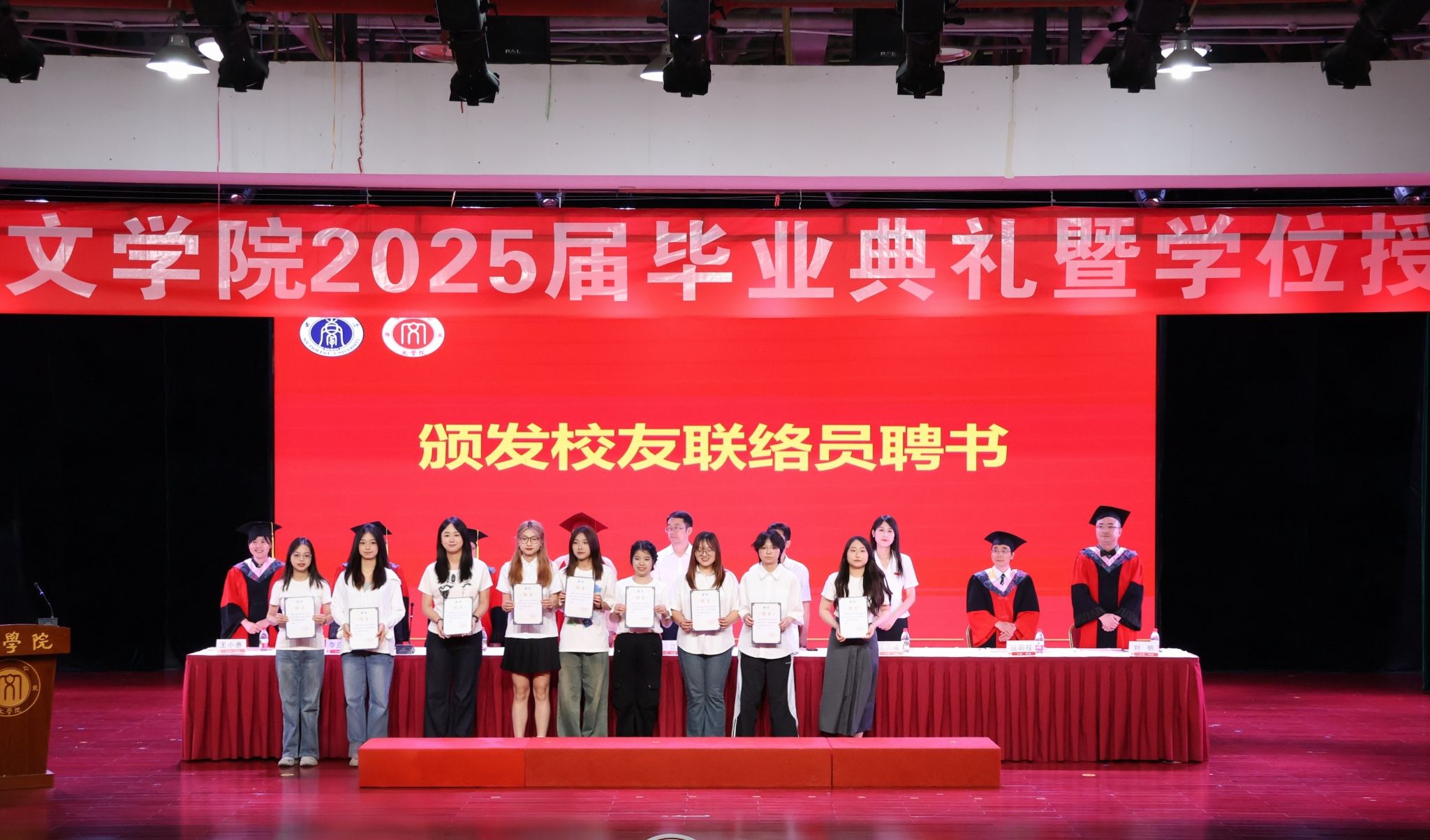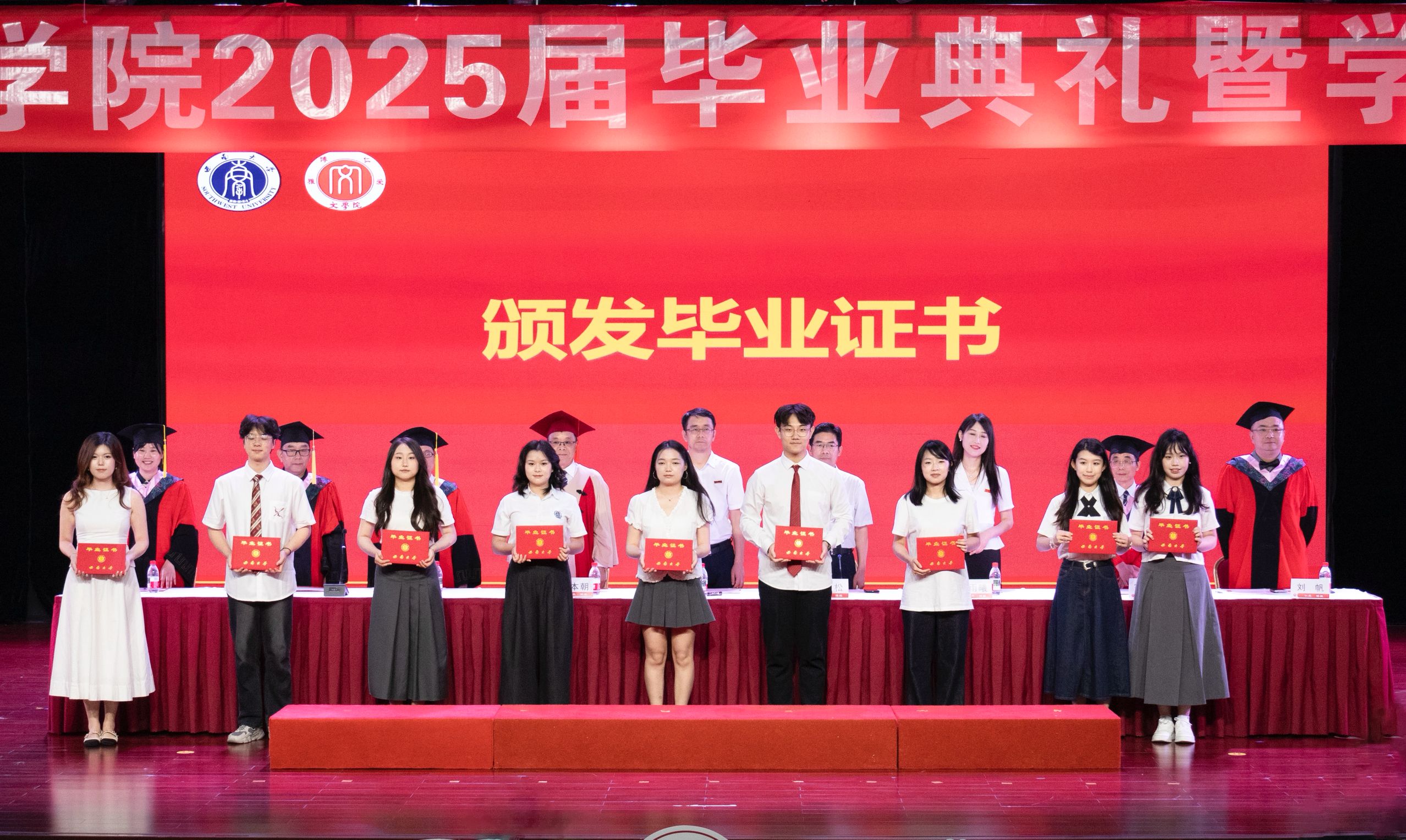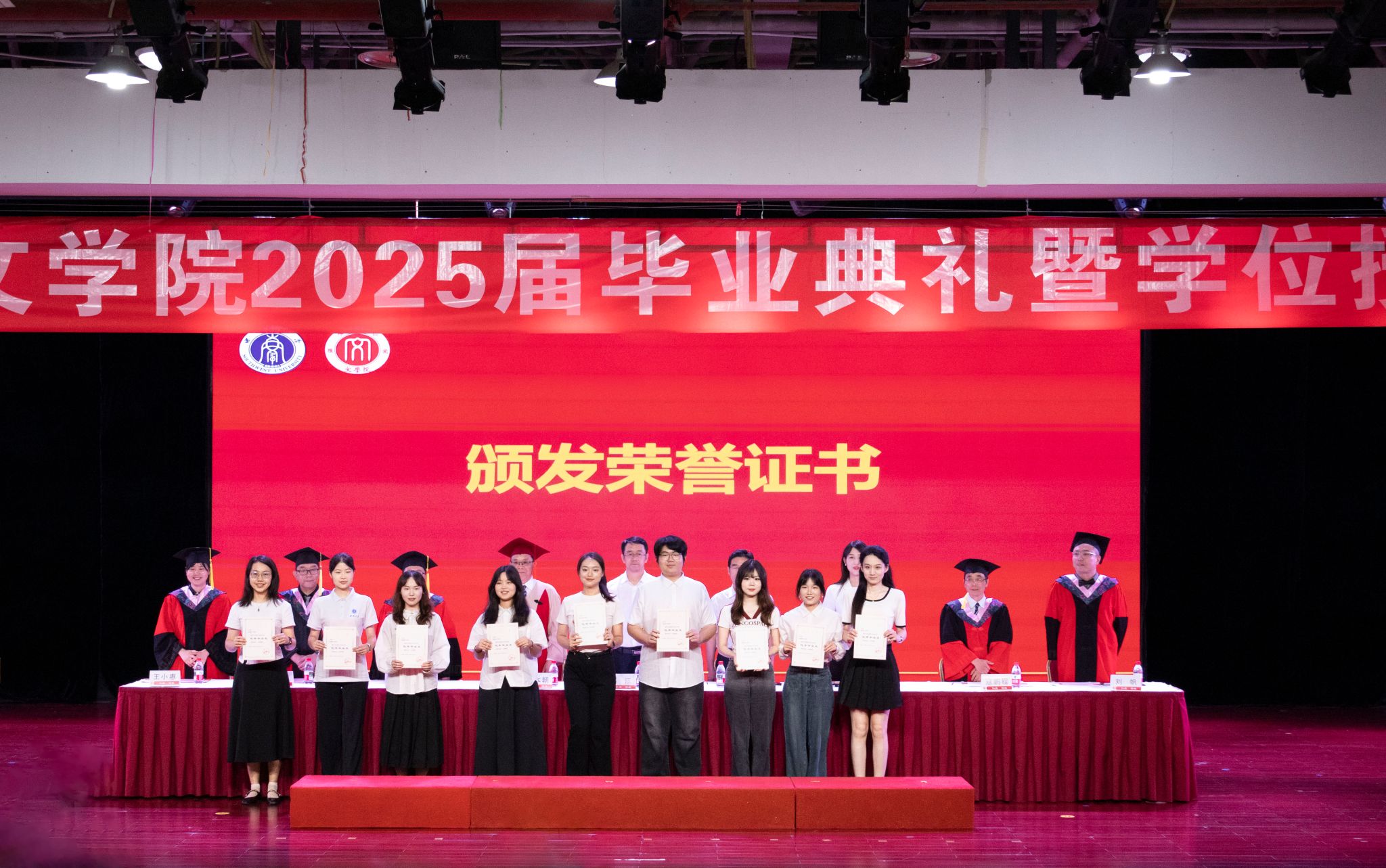 全体博士研究生毕业生、硕士研究生毕业生,本科生毕业生代表依次上台领取毕业证书。荣誉称号获得者上台接受表彰。校友联络员上台领取聘书。