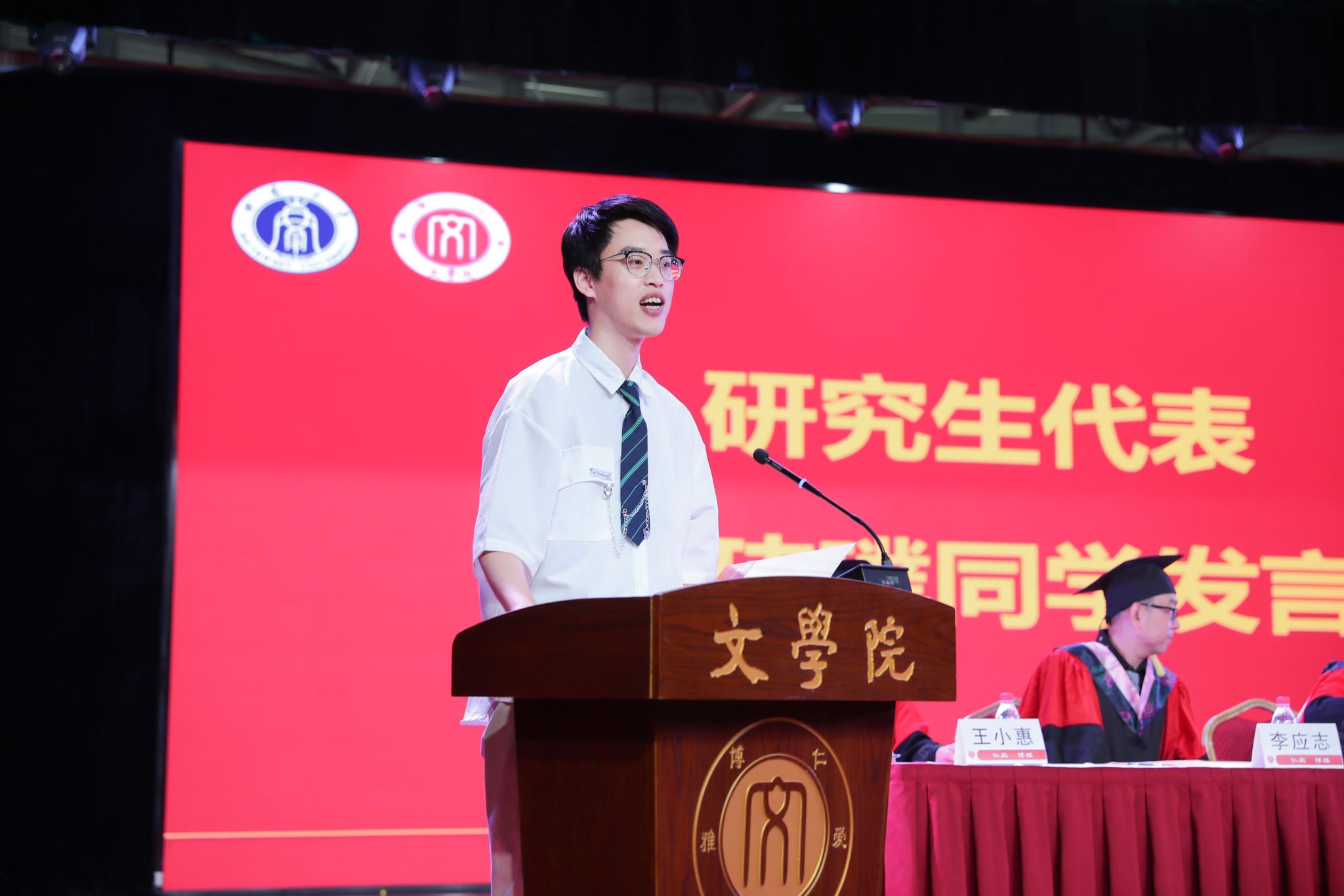 2022级中国现古代文学专业硕士研究生周玮璞、2021级汉语言文学(国家优师专项)专业本科生赵秉珠依次上台发言。周玮璞分享了读研期间的学术成长,感恩学院培养,号召同学们长怀热烈、永葆清澈,坚定前行,体验独特人生。赵秉珠分享了本科“在行中学”实践的体悟与成长,希望同学们带着“看见”的能力与“扎根”的意义,在各领域坚定前行。
