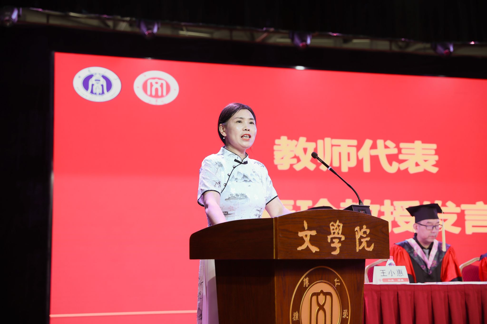 教师代表王春玲教授嘱咐毕业生将面对现实与追求理想结合,建构坚韧自我。她勉励大家肩负责任,砥砺前行;以开阔的心胸捕捉幸福;铭记“含弘光大,继往开来”的校训,守住初心。