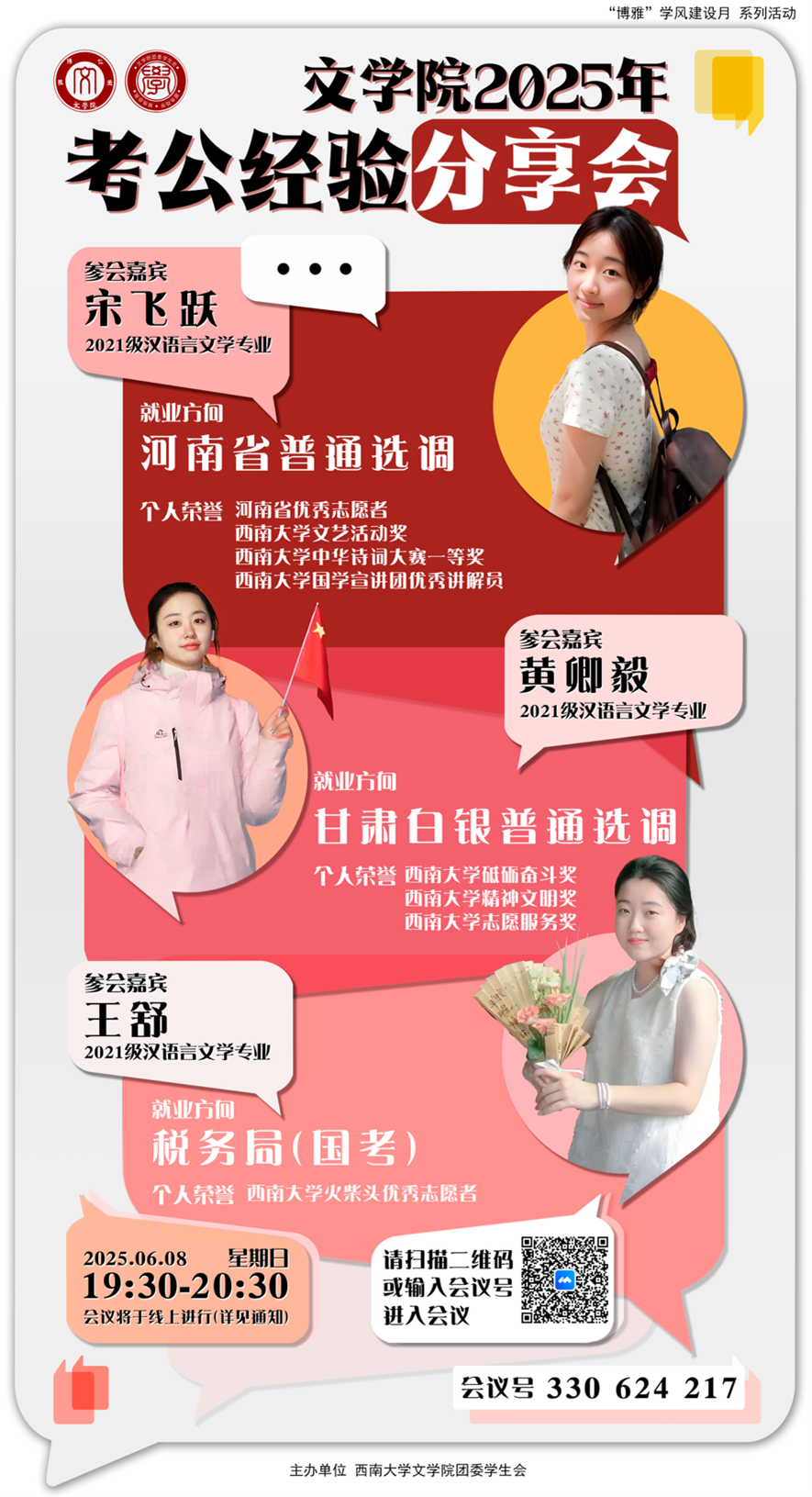 为帮助学生了解考公动态,科学规划备考,促进高质量充分就业,yl7703永利集团6月8日于线上举行2025年考公经验分享会。yl7703永利集团2021级汉语言文学专业宋飞跃、黄卿毅和王舒三位同学受邀分享。