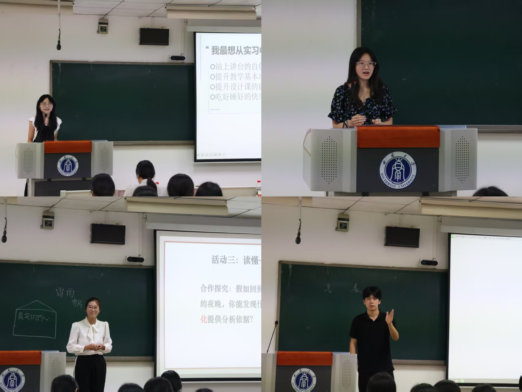 总结会上,王桉钰同学围绕实习全过程,分享个人经验。谢婉清同学结合自身经历,就实习准备工作进行讲解。刘奕菲和张裕同学分别开展了10分钟的微课展示。最后,魏小娜教授进行总结,指出实习生们的分享内容真切明晰,微课展示效果良好,同时鼓励师范生们锤炼专业本领,坚持守正创新,时刻做好迎接新挑战的准备。
